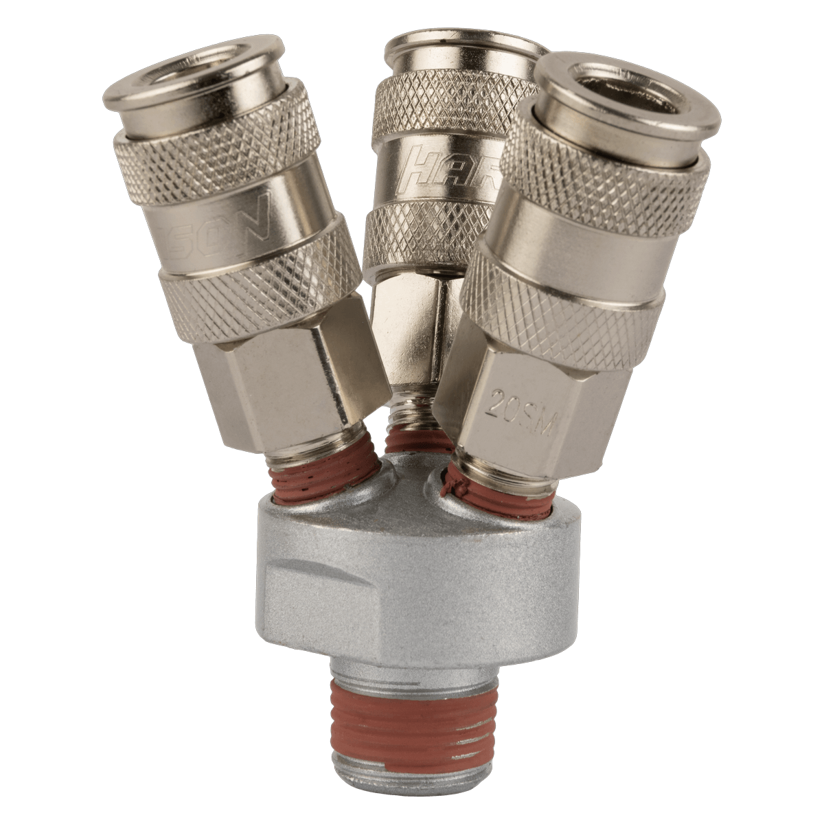 Разветвитель пневматический Y-образный HRS-SMYT используется совместно с компрессорным оборудованием для подключения двух пневмоинструментов. Изготовлен из стали. Оснащен тремя разъемами рапид тип «мама». Отдельного внимания заслуживает наличие двух вариантов резьбы входного отверстия диаметрами 1/4″F и 3/8″M. Разъем «мама» подсоединяется к подходящему разъему типа «папа».