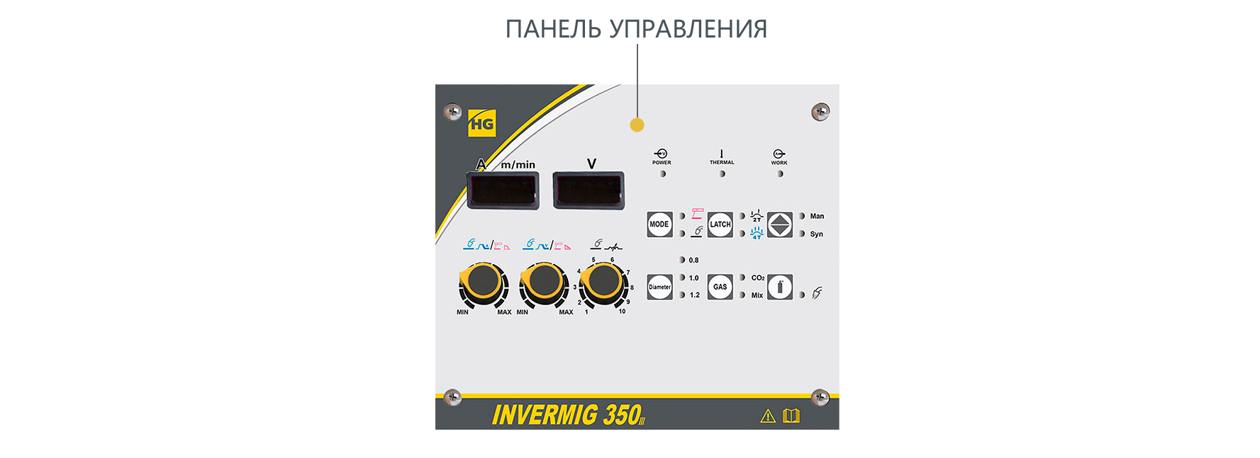 Syn - Синергетический режим. Сварщик самостоятельно может настроить скорость подачи, а напряжение будет подобрано автоматически.