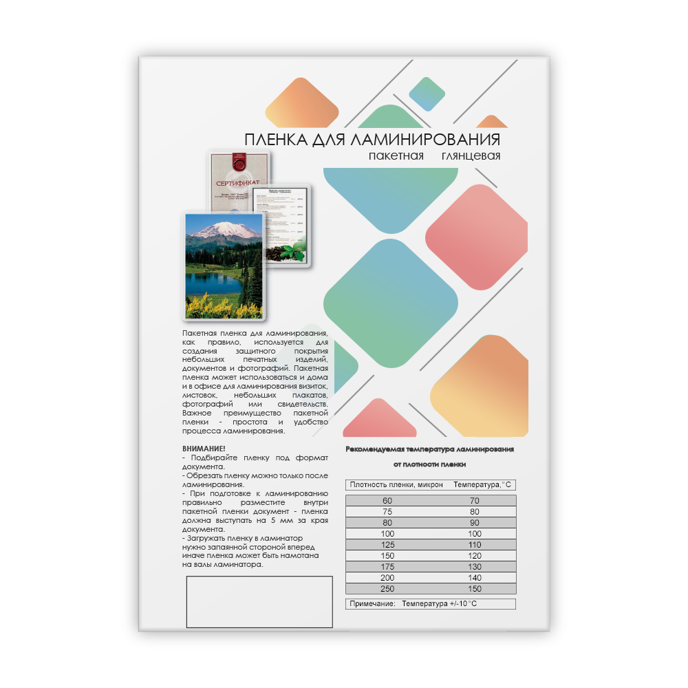 Пленка пакетная для ламинирования Размер 303х426 мм плотность 100 мик 100 штук в пачке. Пленка для ламинирования ГЕЛЕОС A3, 303х426 мм, 100 мкм, глянцевая, 100 шт LPA3-100 предназначена для ламинирования документов и сертификатов. Пленка защищает документы от влаги, надписей и механического воздействия. Модель является универсальной и подходит для пакетных ламинаторов любых марок.