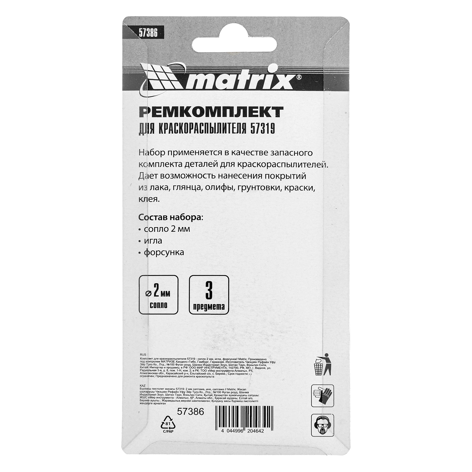 Комплект Matrix 57386 для краскораспылителя Matrix 57319 включает в себя 3 предмета: сопло диаметром 2 мм, иглу и форсунку. Их можно использовать для ремонта инструмента или расширения его функциональных возможностей.