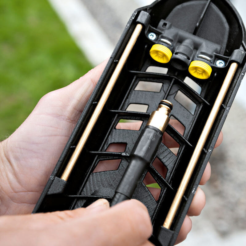 Системное решение от Karcher — "2-в-1" для быстрой прочистки водосточных труб и желобов без использования лестницы. Промывочная головка самопроизвольно перемещается по желобу, эффективно очищая его. Шланг для промывки труб надёжно устраняет засоры в сливных и канализационных трубах. Со шлангом высокого давления длиной 20 м. Принадлежности рассчитаны на максимальное давление — 180 бар.