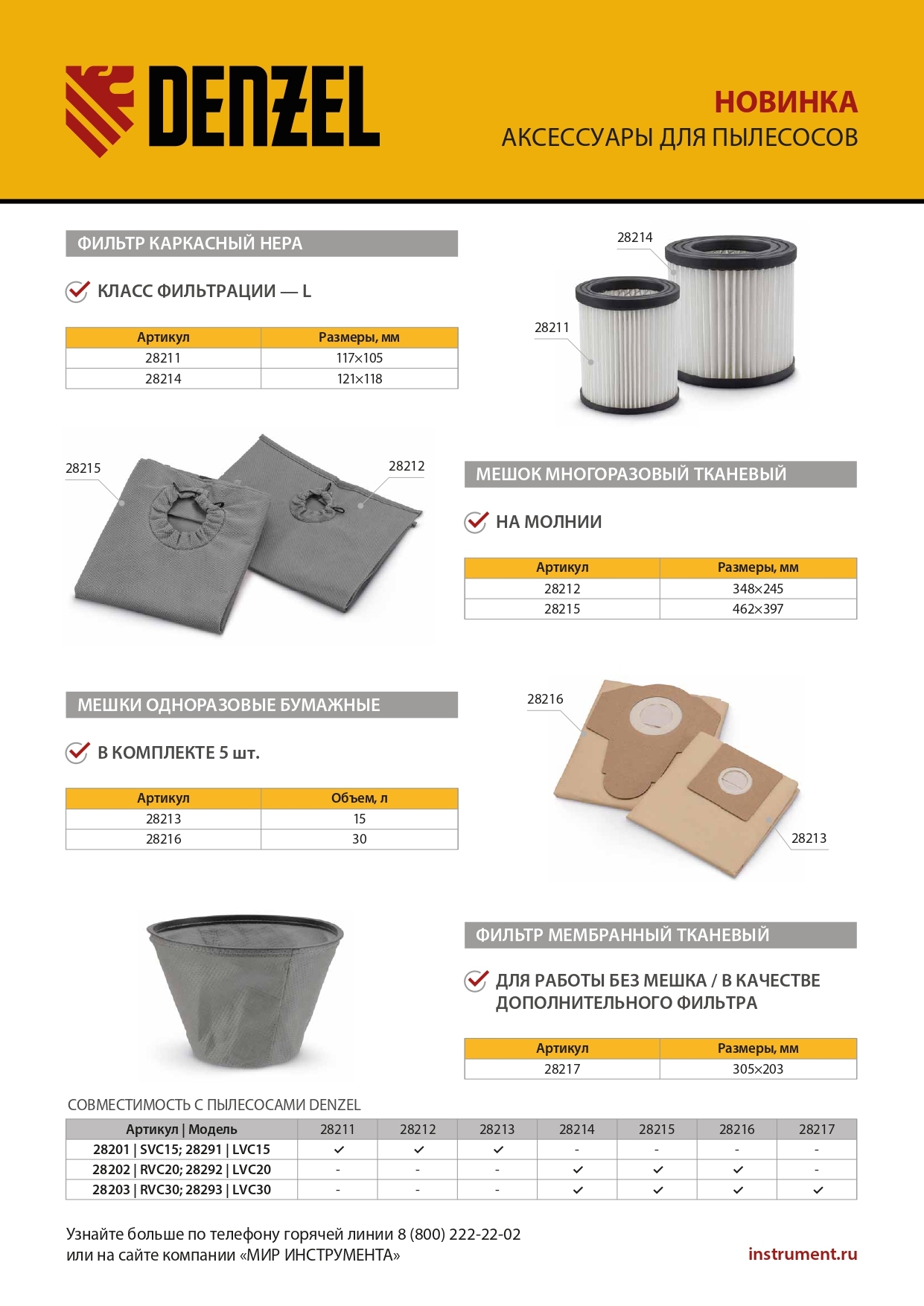 Комплект одноразовых мешков Denzel 28216 представляет собой набор из 5 расходников для строительных пылесосов RVC20 (28202), RVC30 (28203), LVC20 (28292), LVC30 (28293). Мешок объемом 30 л устанавливается в специальное гнездо с внутренней стороны бака и служит для сбора мусора во время сухой уборки.