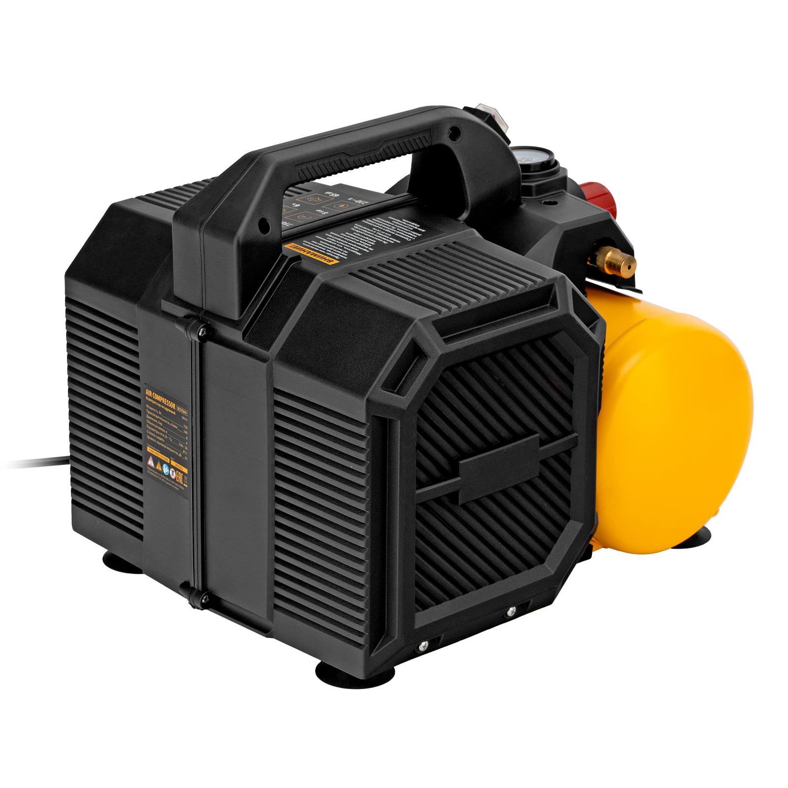 - Удобный контроль давления в ресивере — на компрессор установлен механический манометр, «смотрящий» вверх, поэтому для снятия показаний не нужно присаживаться.