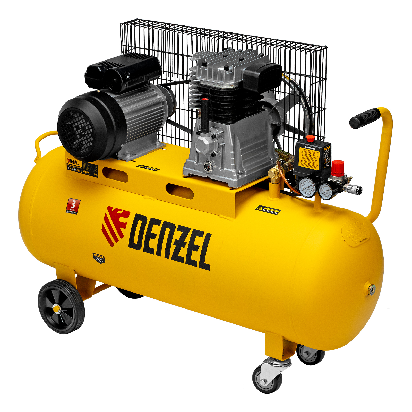 Воздушный компрессор с ременным приводом Denzel BCI2300/100 58114 мощностью 2,3 кВт, с ресивером объемом 100 л, характеризуется производительностью 400 л/мин и используется для обеспечения сжатым воздухом пневмоинструментов, таких как краскопульт, гайковерт, гвоздезабивной пистолет, дрель, пистолет для накачки шин и т.д. Максимальное рабочее давление составляет 10 бар. Благодаря высокой производительности компрессор будет полезен не только в загородном доме и гараже, но и на фабрике, станции технического обслуживания автомобилей, мастерской.