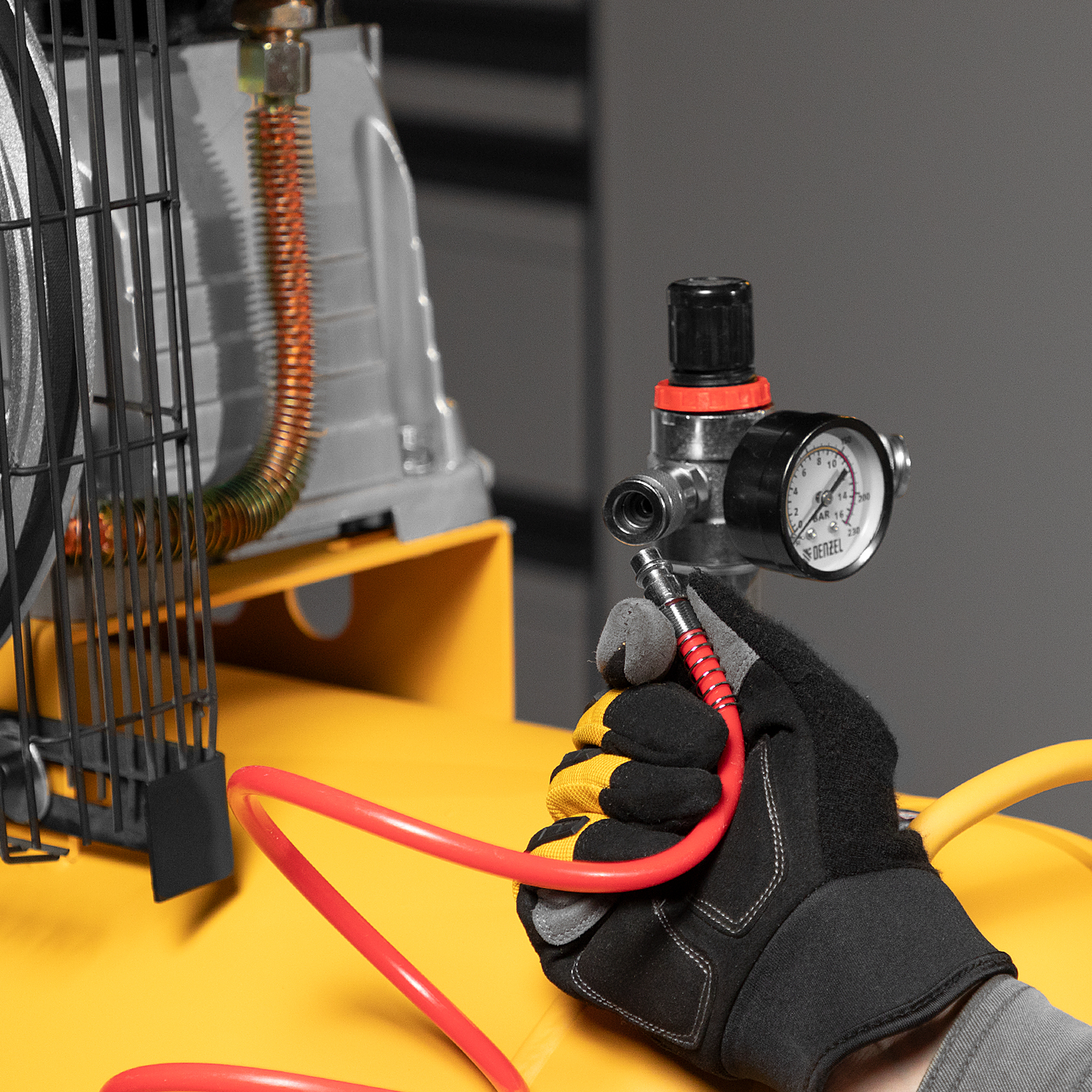 - Автоматический спускной клапан — лишнее давление быстро сбрасывается без вреда для компрессора.