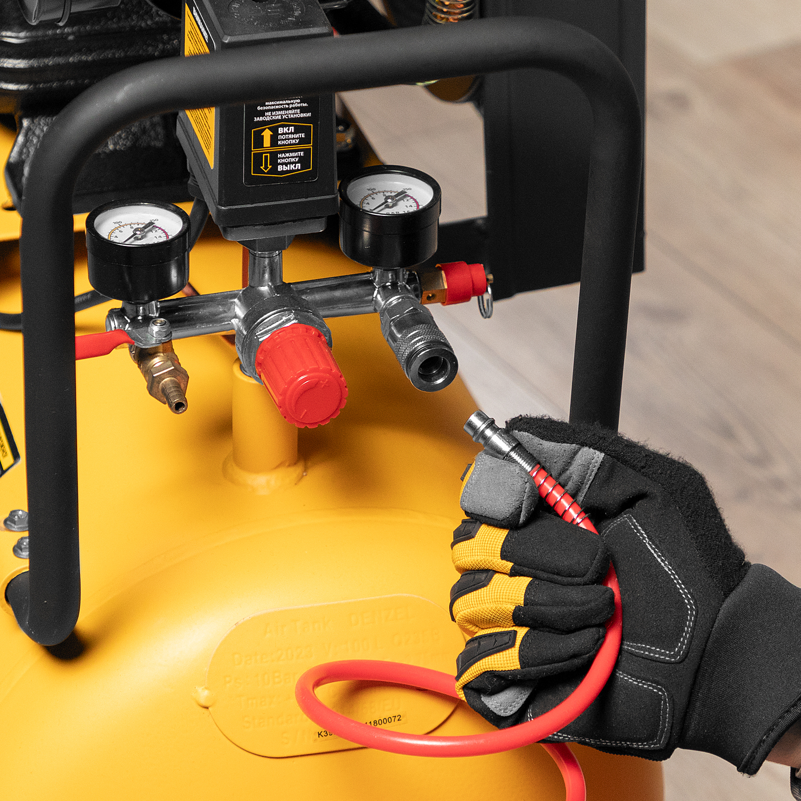 - Регулятор выходного давления — в зависимости от типа пневматического инструмента мастер может точно настроить необходимый уровень давления, чтобы добиться идеального результата.