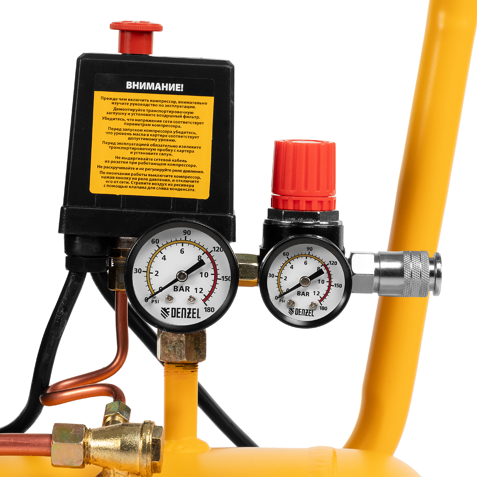 - Контроль рабочих параметров — два манометра отображают давление в ресивере и выходной магистрали.