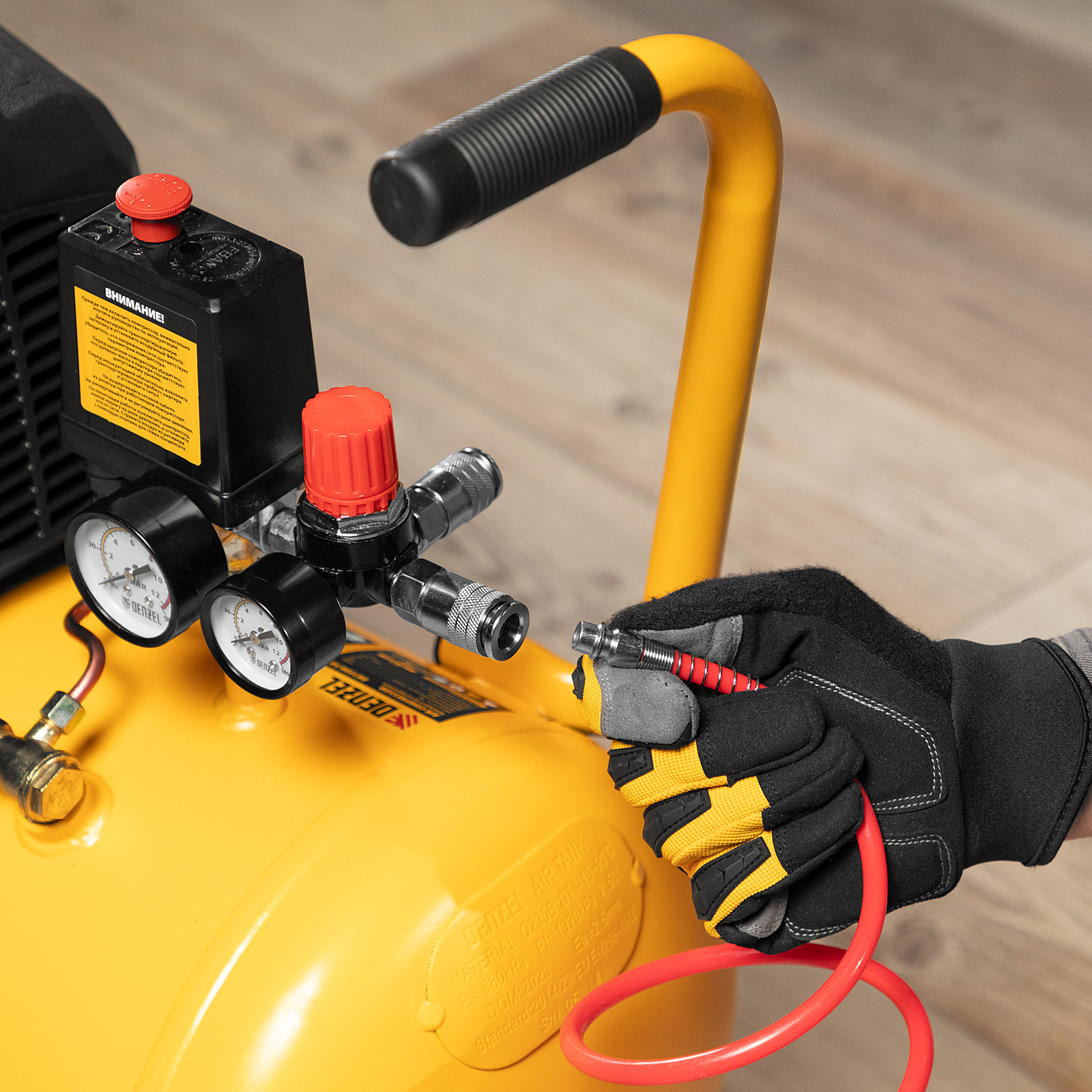 - Мобильность — транспортировочные колеса позволяют легко перемещать компрессор по рабочей площадке.