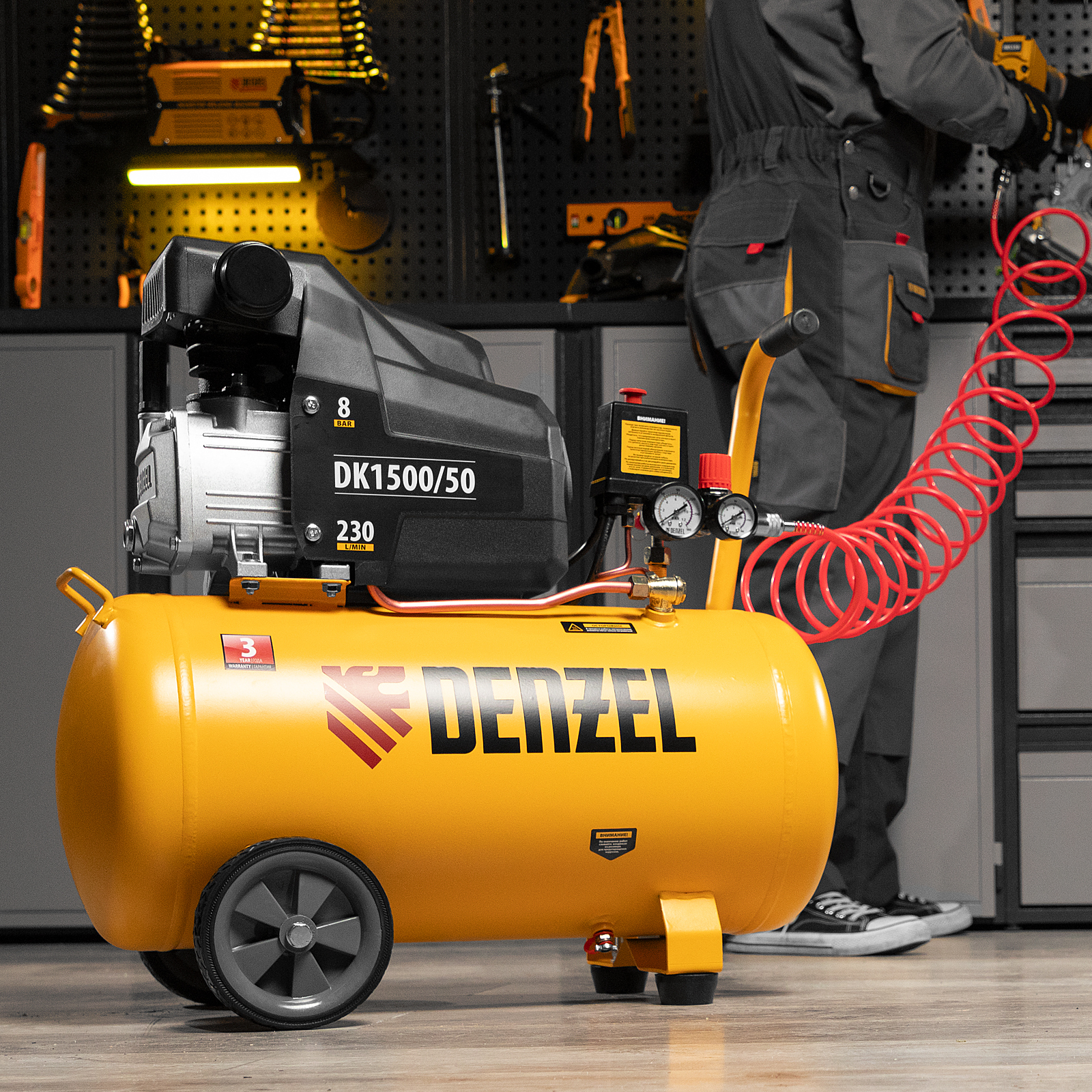 Воздушный компрессор Denzel Х-PRO DK1500/50 58064 мощностью 1,5 кВт, производительностью 230 л/мин, имеет ресивер объемом 50 л и подходит для бытового использования. Обеспечивает подачу воздуха к различным пневматическим инструментам: шуруповерту, краскопульту и др. Будет незаменим в гараже, когда надо подкачать колеса автомобиля или подкрасить его отдельные детали, а также на даче или в частной мастерской. Несмотря на простоту конструкции, компрессор имеет хорошую производительность и возможность подключения сразу нескольких инструментов.