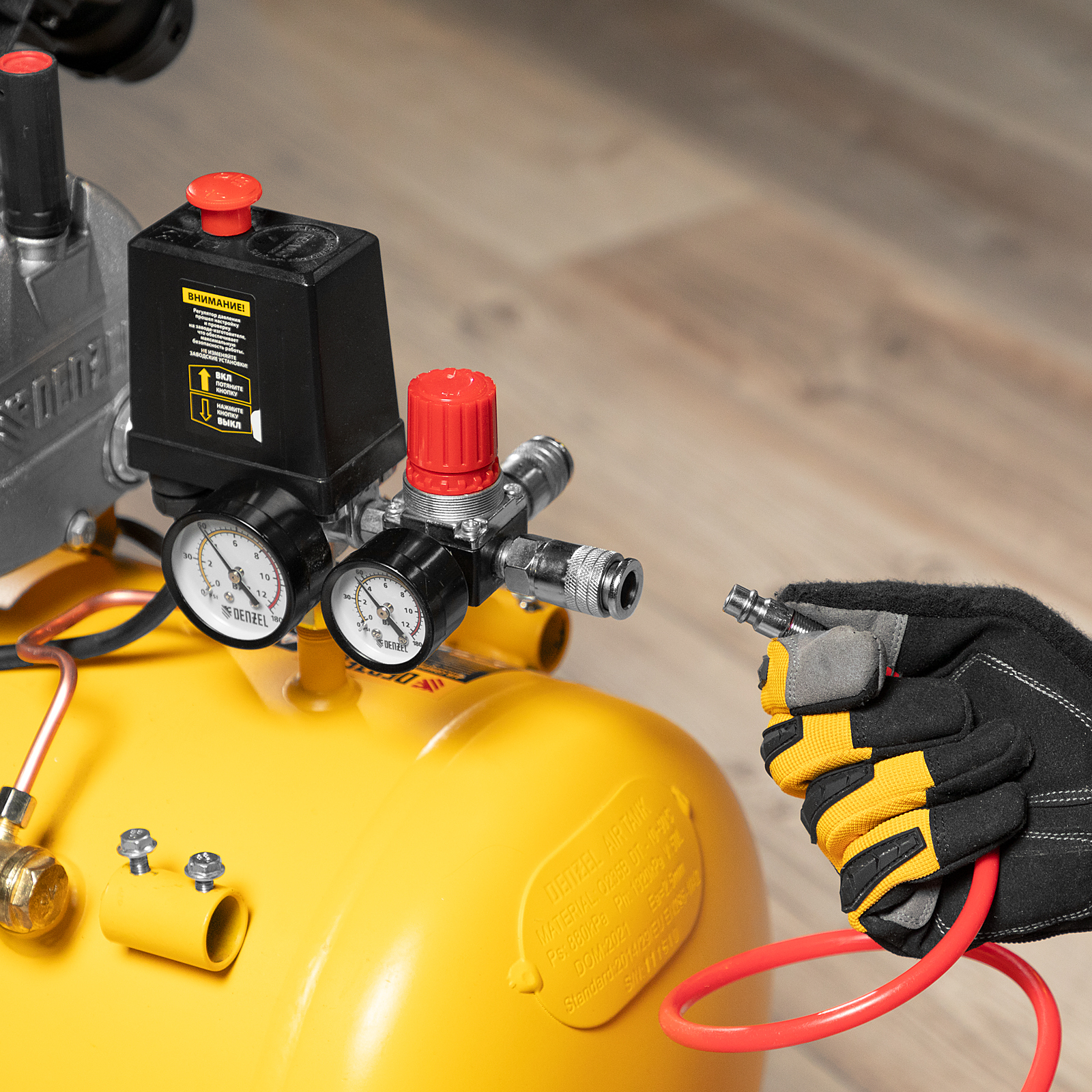 - Контроль рабочих параметров — 2 манометра облегчают отслеживание давления в ресивере и пневмомагистрали.