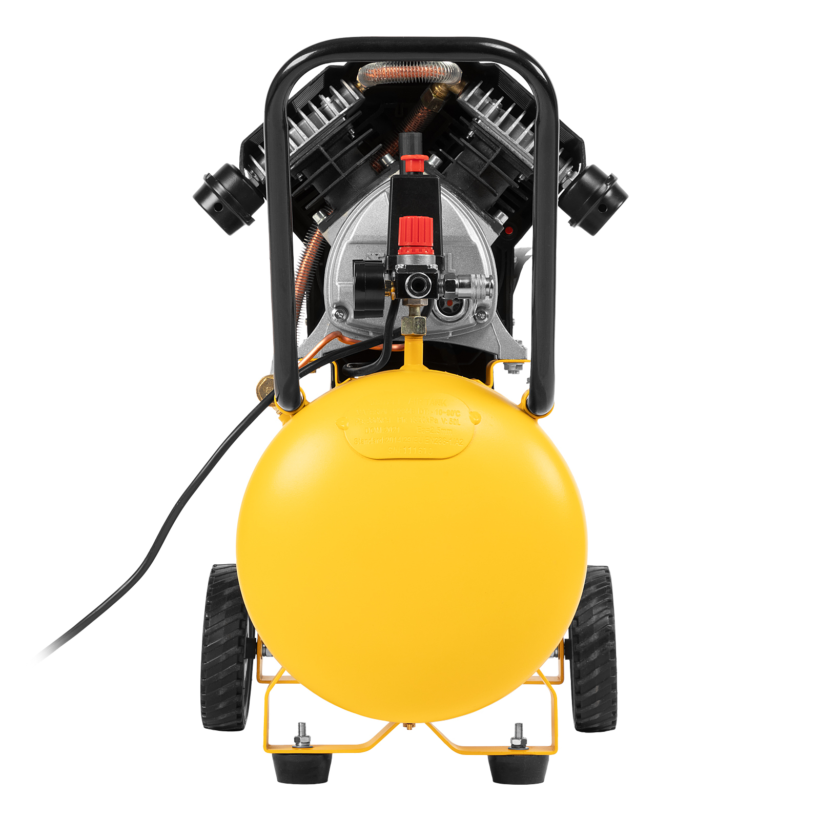 - Удобное перемещение — компрессор оснащен колесами и П-образной ручкой.