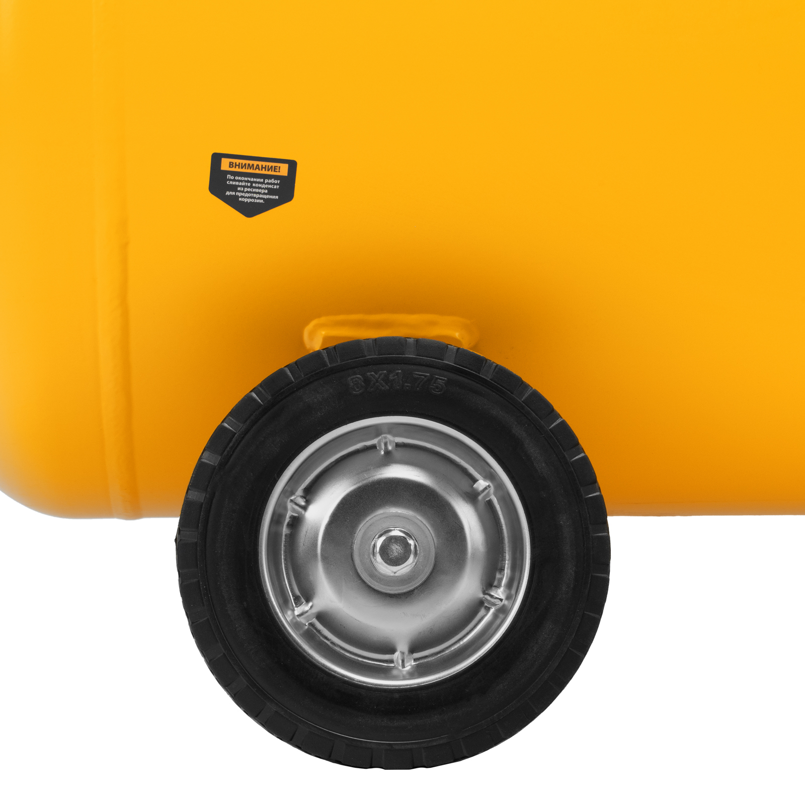 - Удобная транспортировка — на компрессоре установлены колеса, в т. ч. поворотные, и П-образная рукоятка.