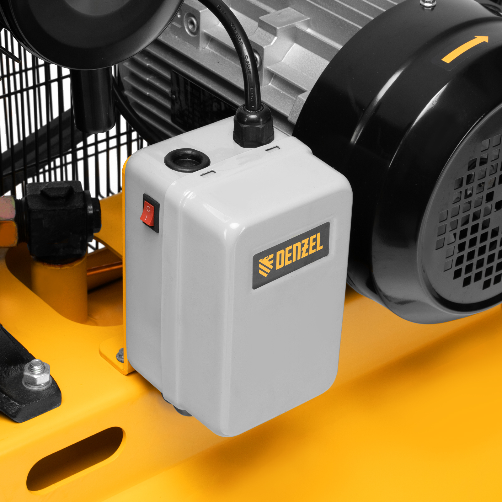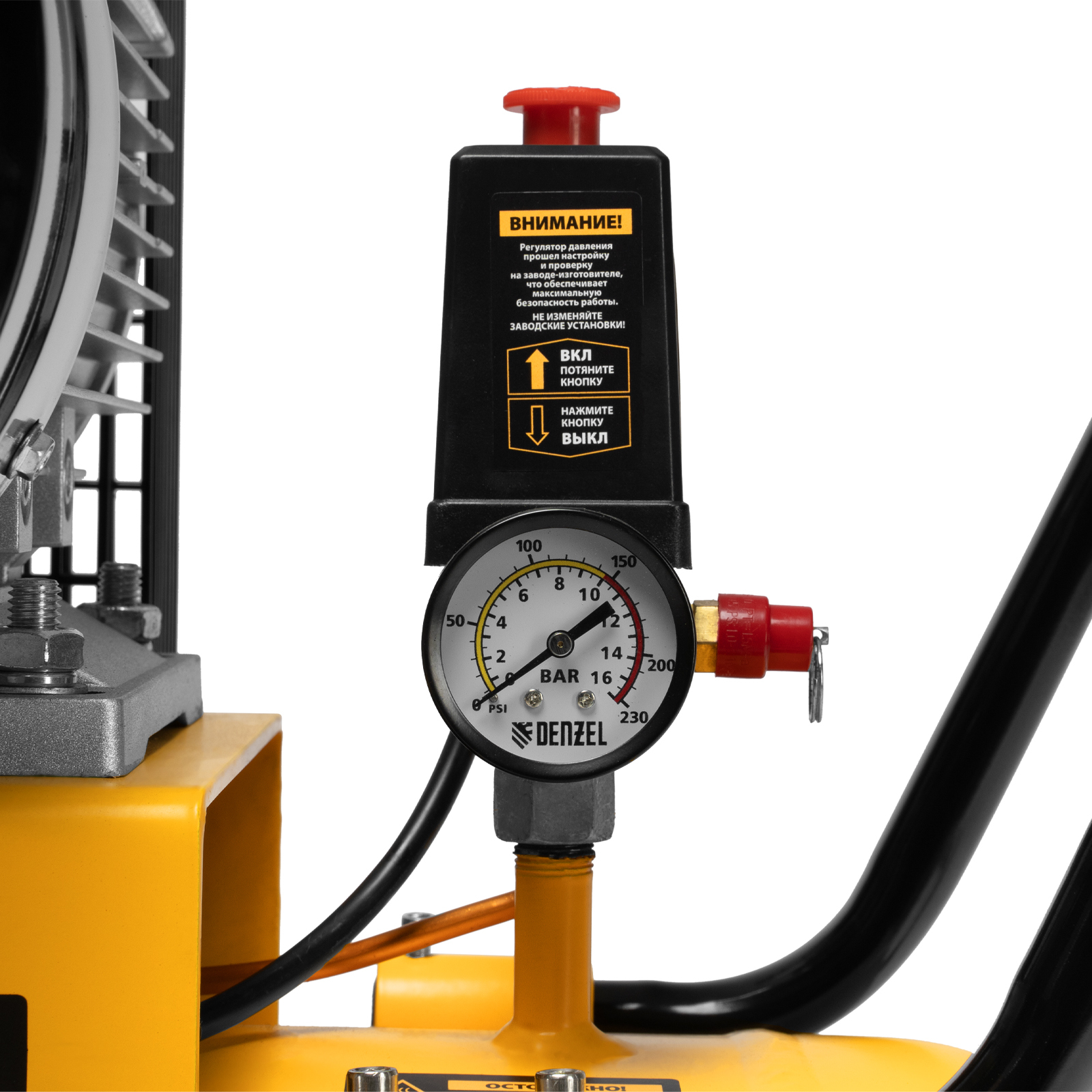 - Автономная работа — прессостат останавливает компрессор по достижении максимального рабочего давления 10 бар и запускает его, если давление падает ниже допустимого уровня.