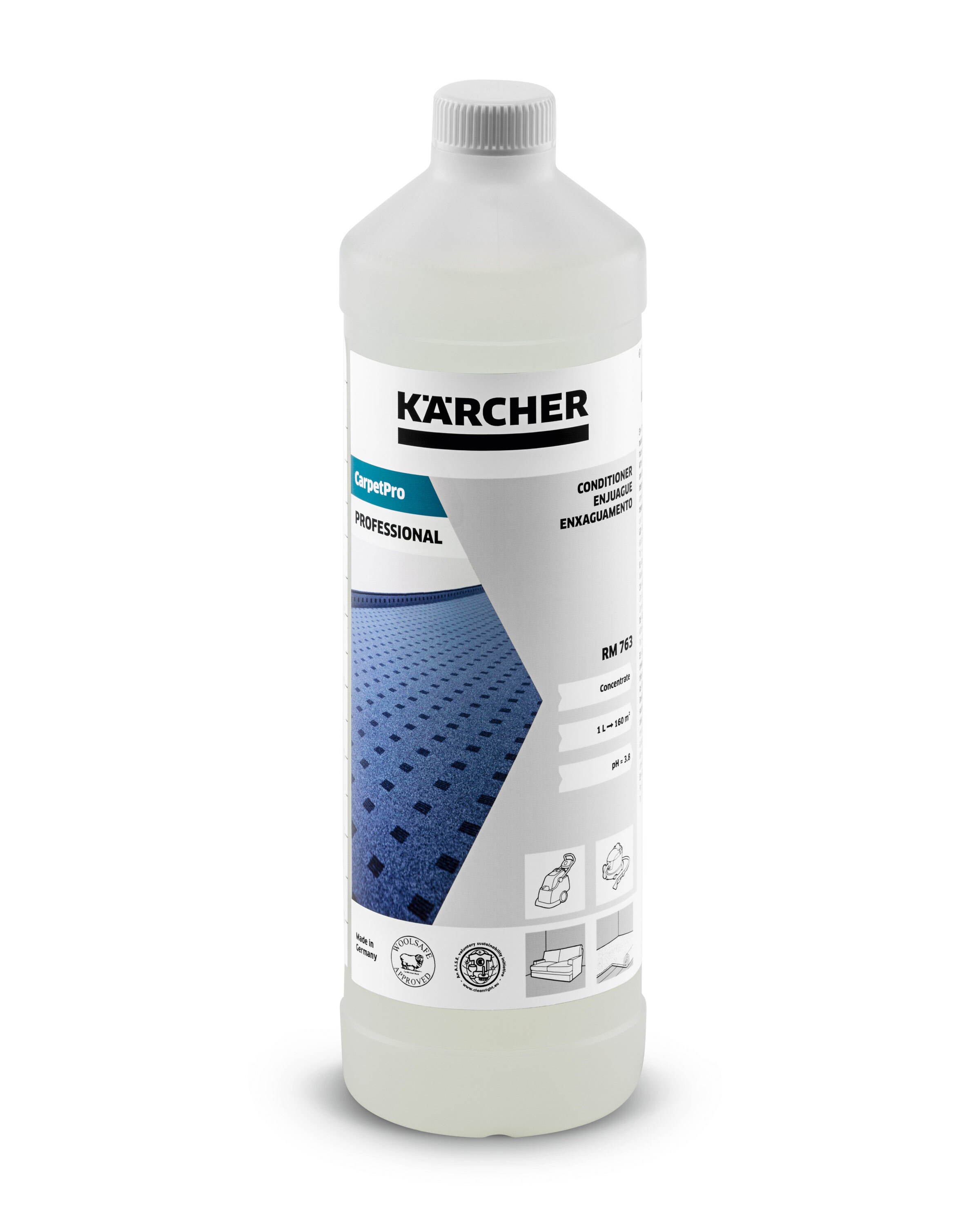CarpetPro RM 763 - высокоэффективное средство (кондиционер) для промывки ковров с волокнами всех типов с помощью моющего пылесоса, удаляющее остатки грязи и поверхностно-активных веществ, сокращает трудозатраты и время на заключительную промывку, освежает краски. Слабокислое pH:3,8. Не содержит NTA (нитрилотриацетат натрия). Безопасно для изделий из натуральной шерсти. Дозировка - 1%.