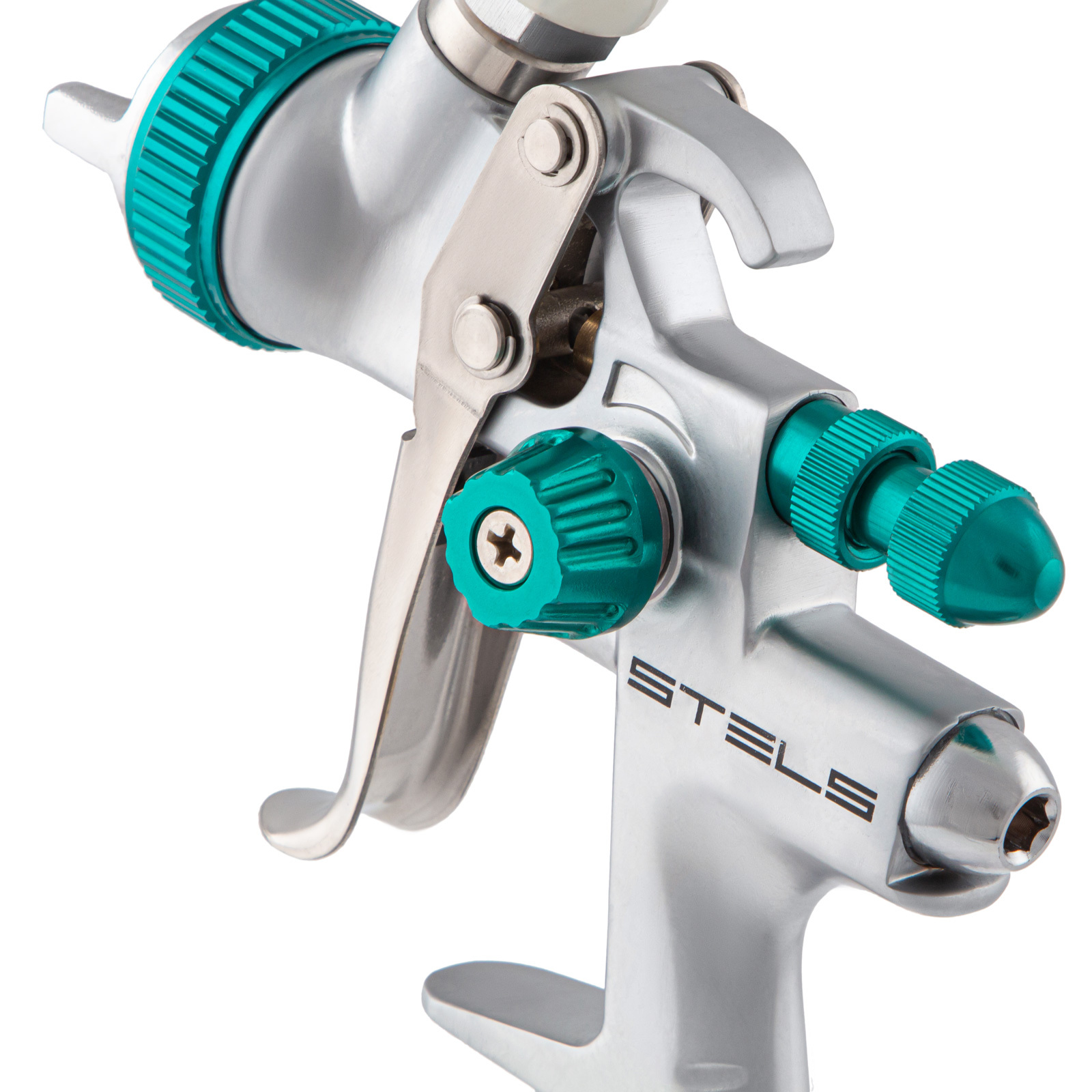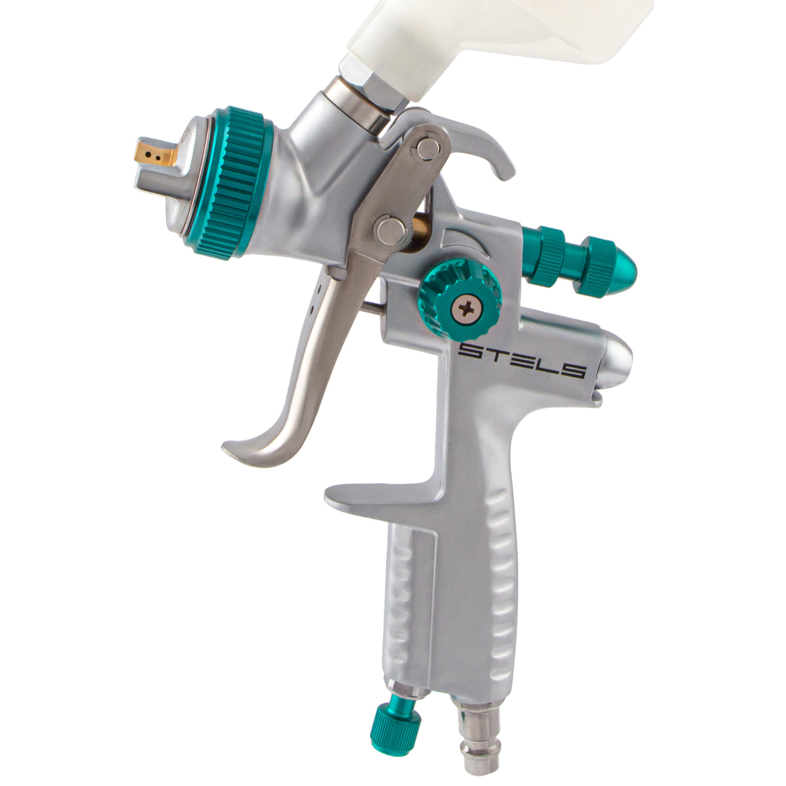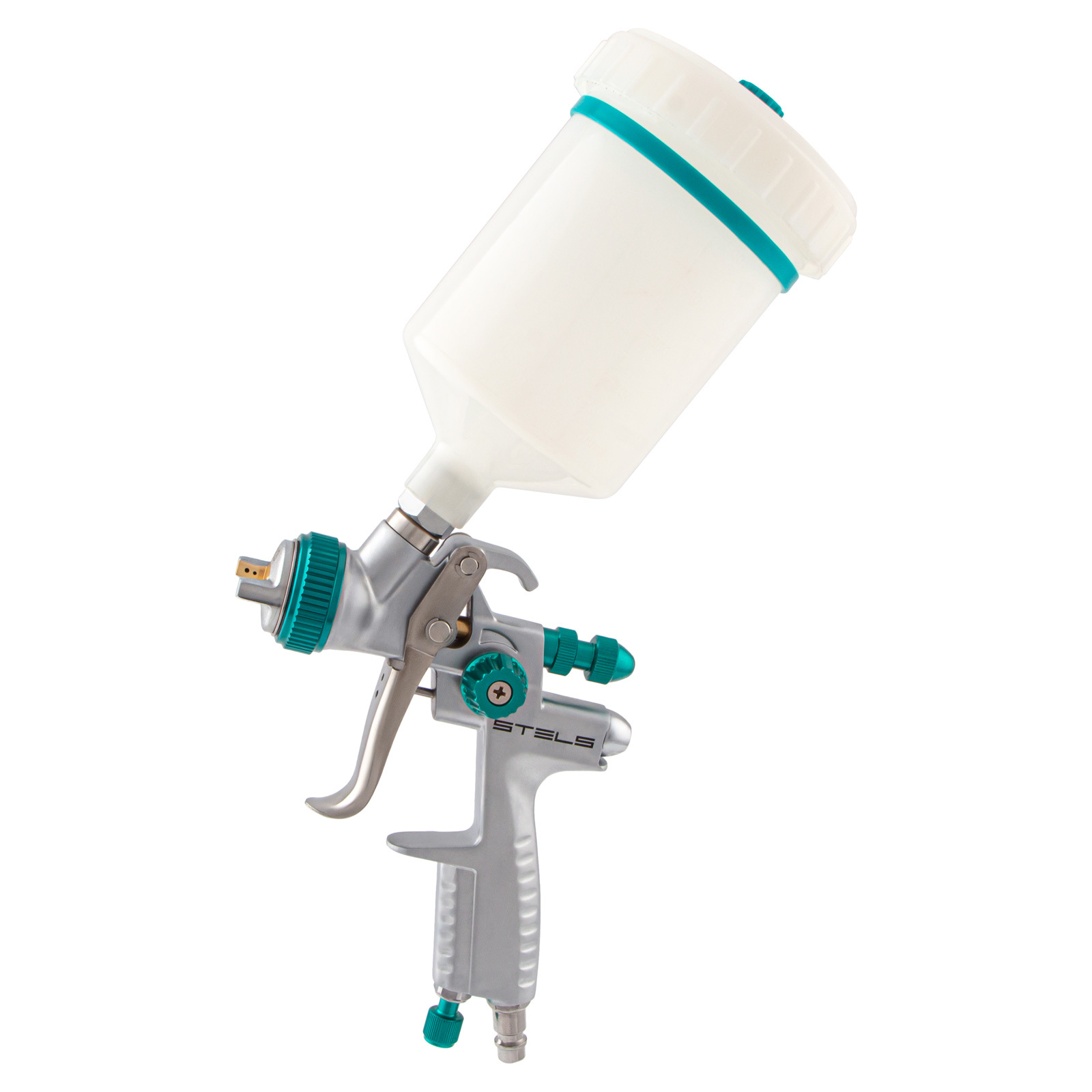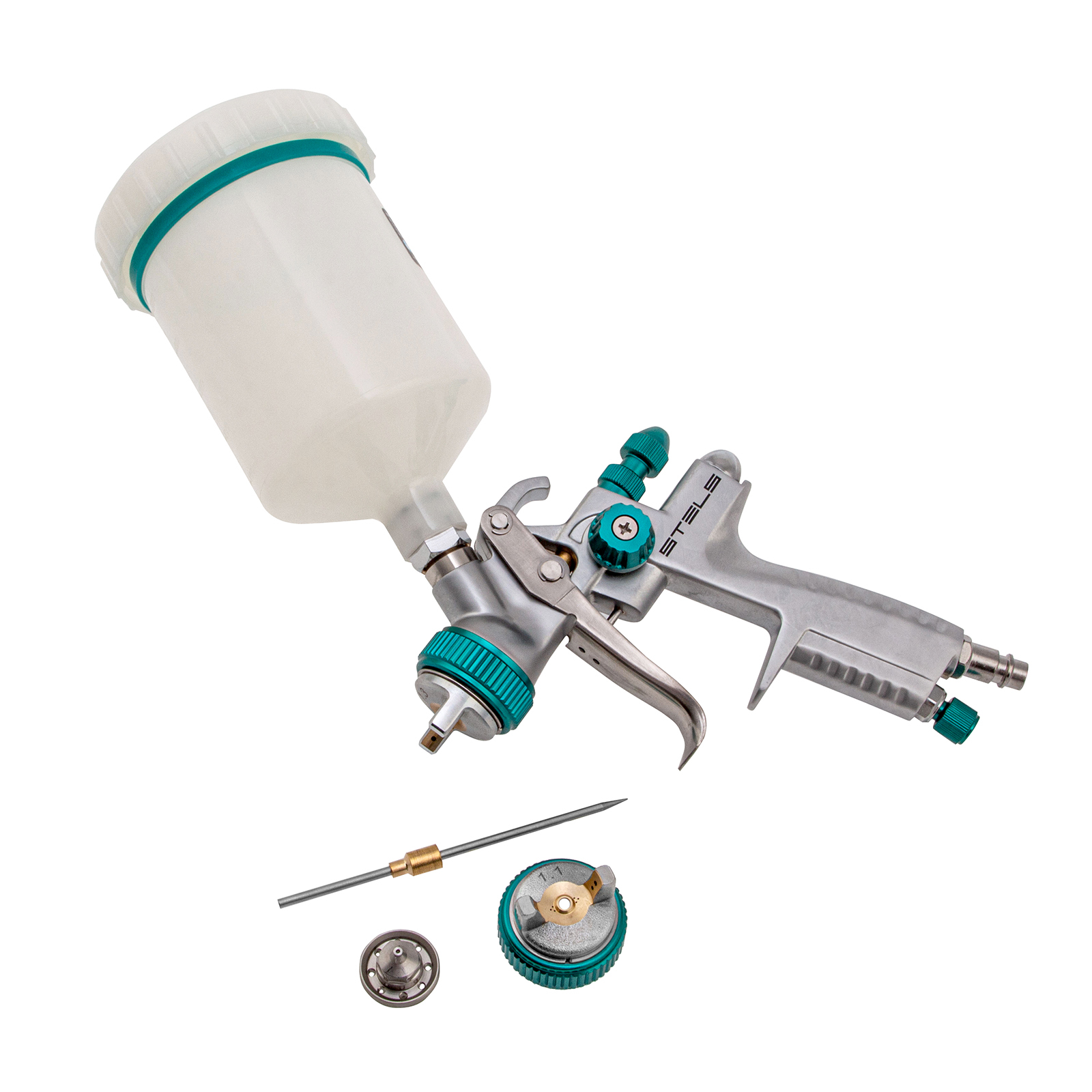 Краскораспылитель гравитационного типа Stels AG 901 LVMP 57365 с соплами диаметром 1,3 и 1,1 мм предназначен для профессионального окрашивания, нанесения эмали и лака на поверхности, грунтовки стен, побелки потолков, опрыскивания растений и т.д. Формирует мягкий широкий факел под давлением 2,5 бар и распыляет материалы равномерно, без образования подтеков.