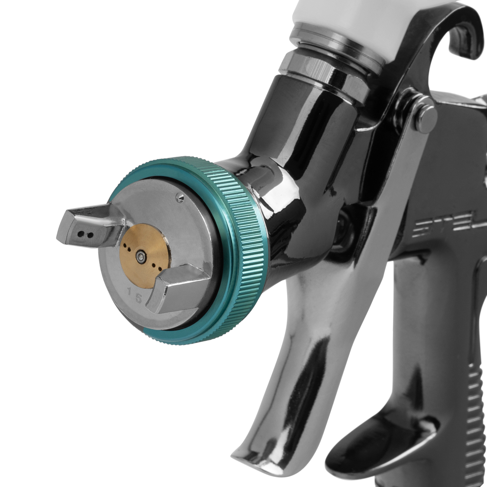 Профессиональный пневматический краскораспылитель гравитационного типа Stels AG 950 LVLP 57367 с соплом диаметром 1,5 мм подходит для проведения окрасочных работ, покрытия керамики глазурью, грунтовки стен, побелки потолков, лакирования дерева. Технология «Низкий объем, низкое давление» (Low Volume Low Pressure) позволяет уменьшить расход окрасочного материала до 140-190 мл/мин и добиться его 80-процентного переноса на обрабатываемую поверхность. Поэтому краскопульт отлично подойдет для применения как в быту, так и на производствах.