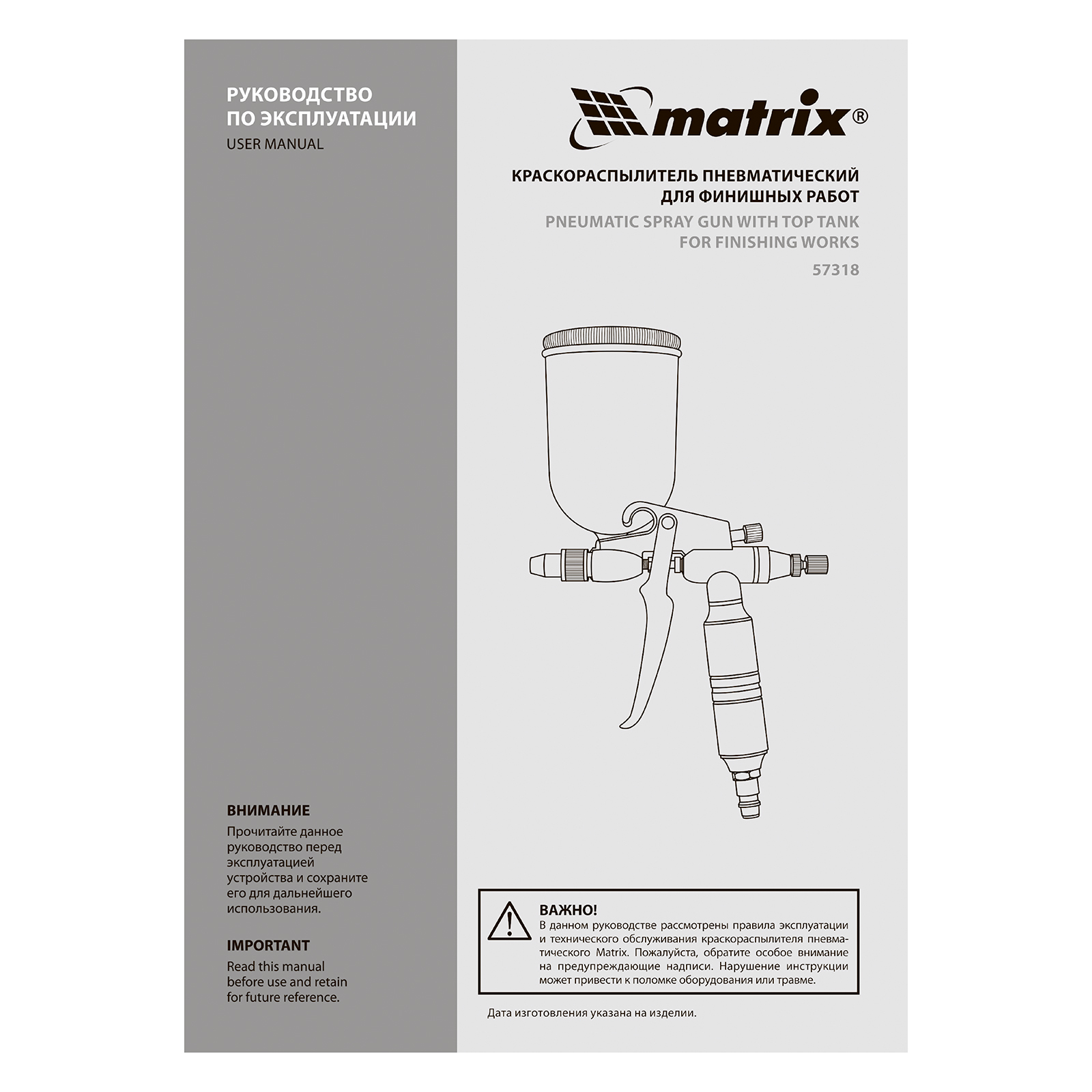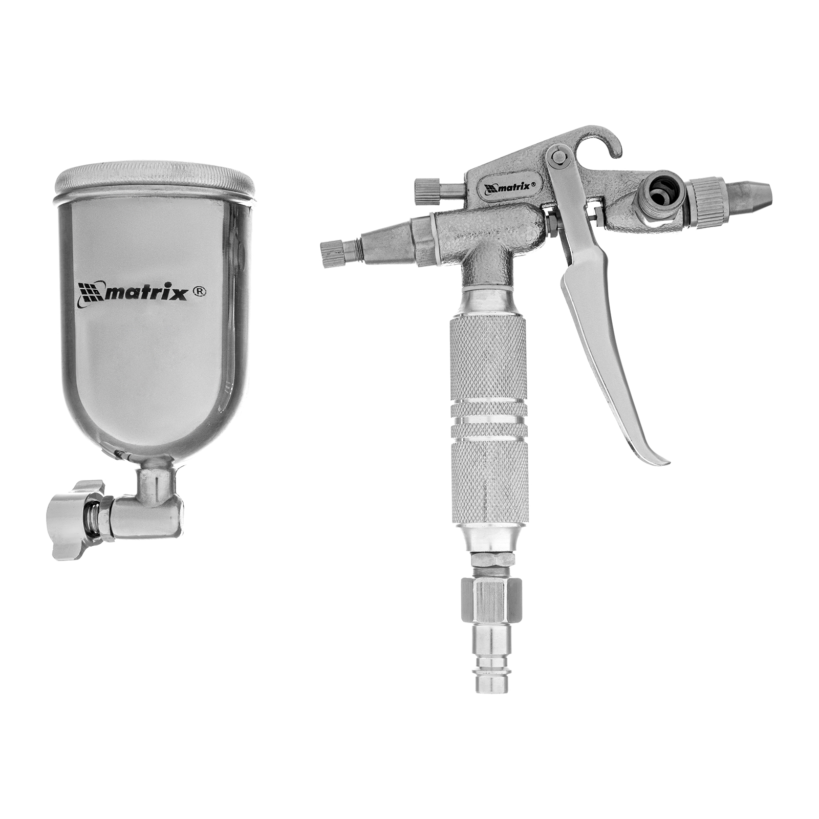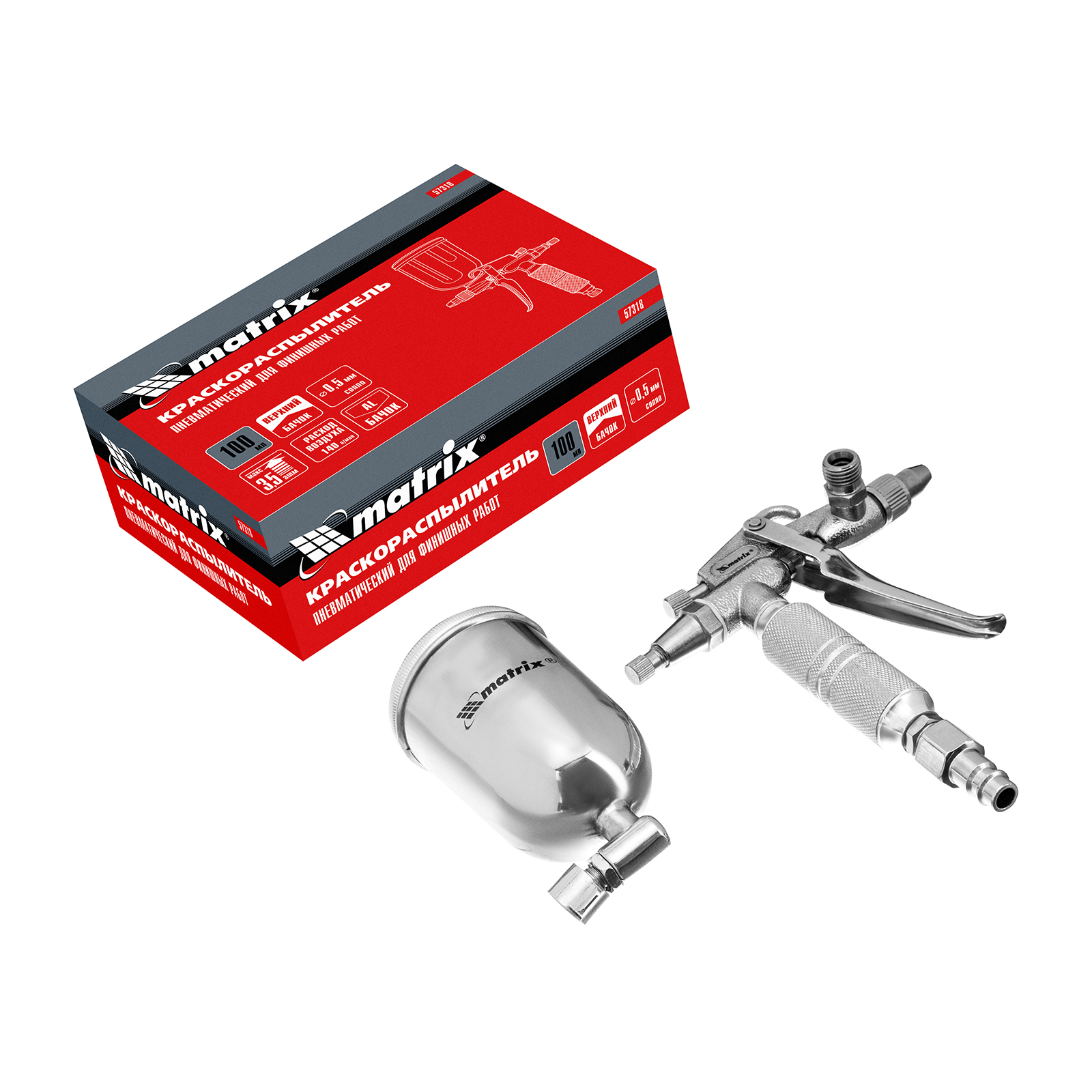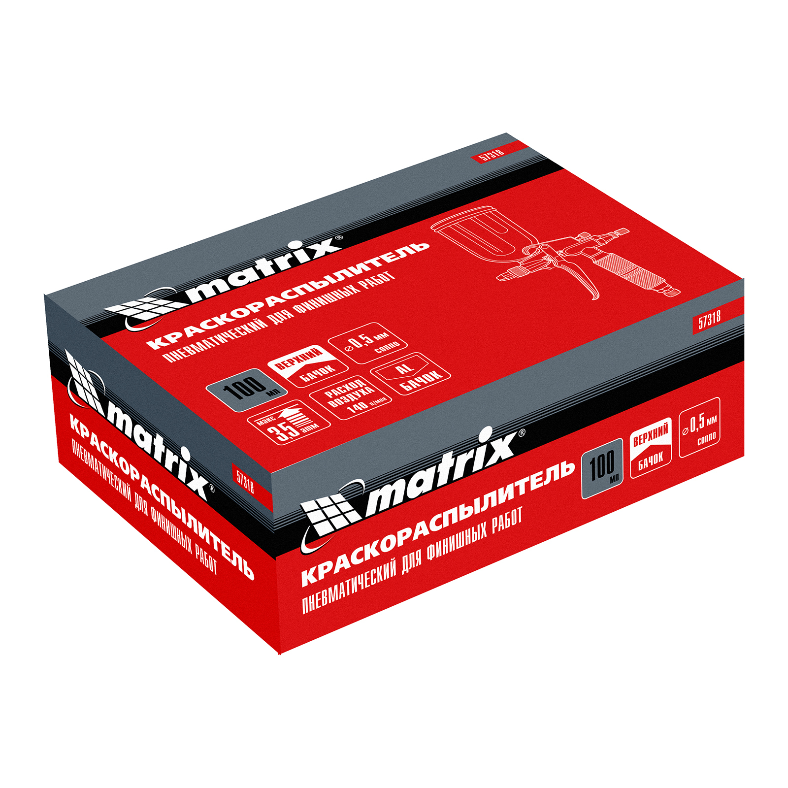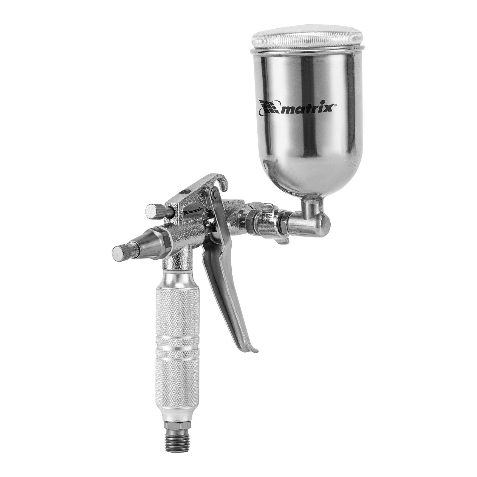Пневматический краскораспылитель Matrix 57318 с верхним бачком объемом 0,1 л и соплом диаметром 0,5 мм позволяет равномерно распределить грунтовку или краску по поверхности и применяется для финишных работ. Краскопульт можно использовать с масляными и латексными красками, воздух расходуется со скоростью 140 л/мин.