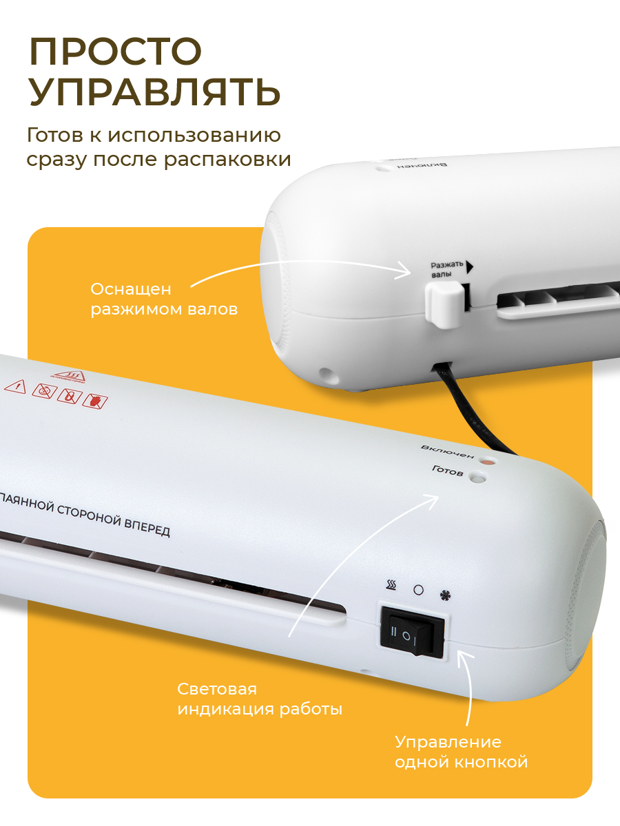 Ламинатор оснащен функцией разжима валов и удобной световой индикацией. Прост и удобен в использовании. Компактен при хранении.