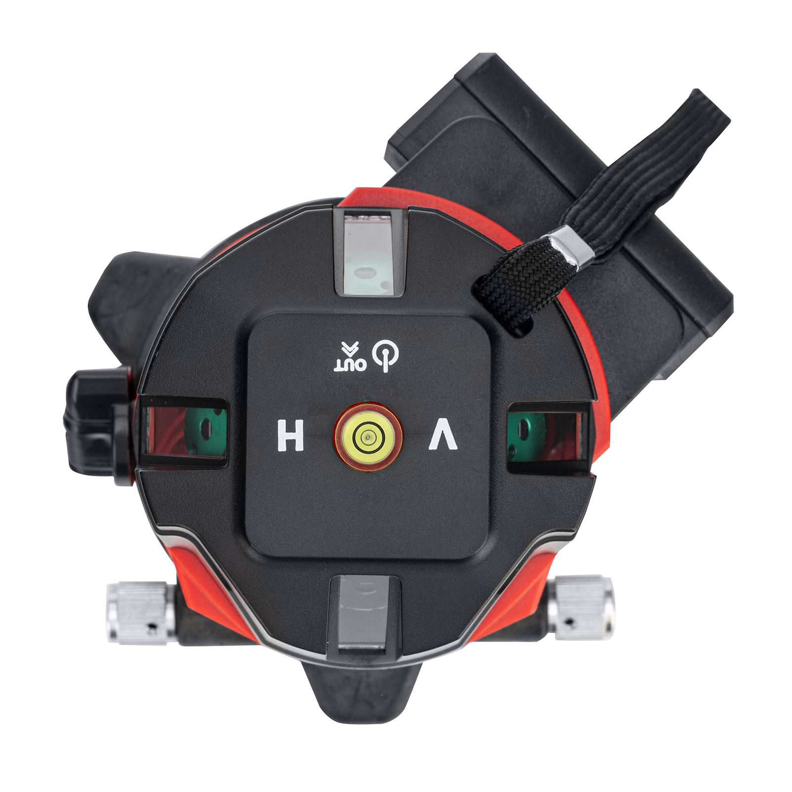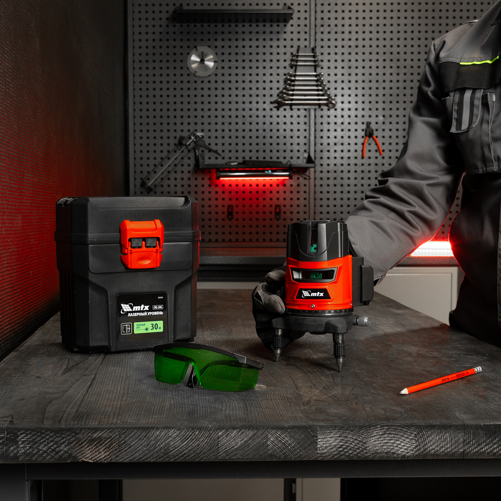 Лазерный уровень MTX CRL-30G 35036 с резьбой 5/8″ под штатив, в комплекте с батарейками, проецирует на поверхность 1 горизонтальный, 4 вертикальных луча зеленого цвета и точку отвеса дальностью до 30 м. Подходит для бытового применения в помещениях. Погрешность измерений составляет всего ±1,5 мм 5 м.