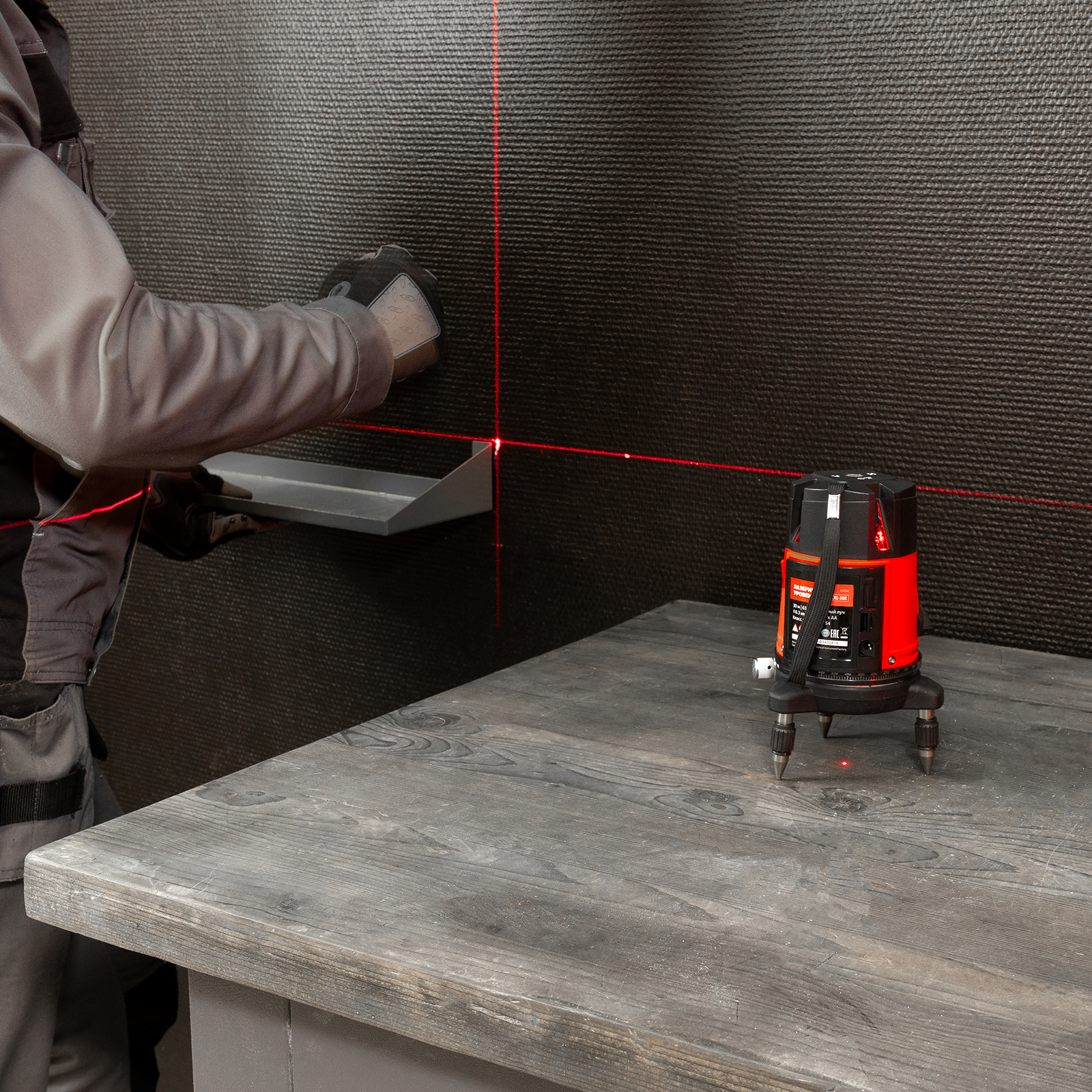 Лазерный уровень MTX CRL-30R 35034 с резьбой 5/8″ под штатив, в комплекте с батарейками, проецирует на поверхность 1 горизонтальный, 4 вертикальных луча красного цвета и точку отвеса дальностью до 30 м. Подходит для бытового применения в помещениях. Погрешность измерений составляет всего ±1,5 мм 5 м.