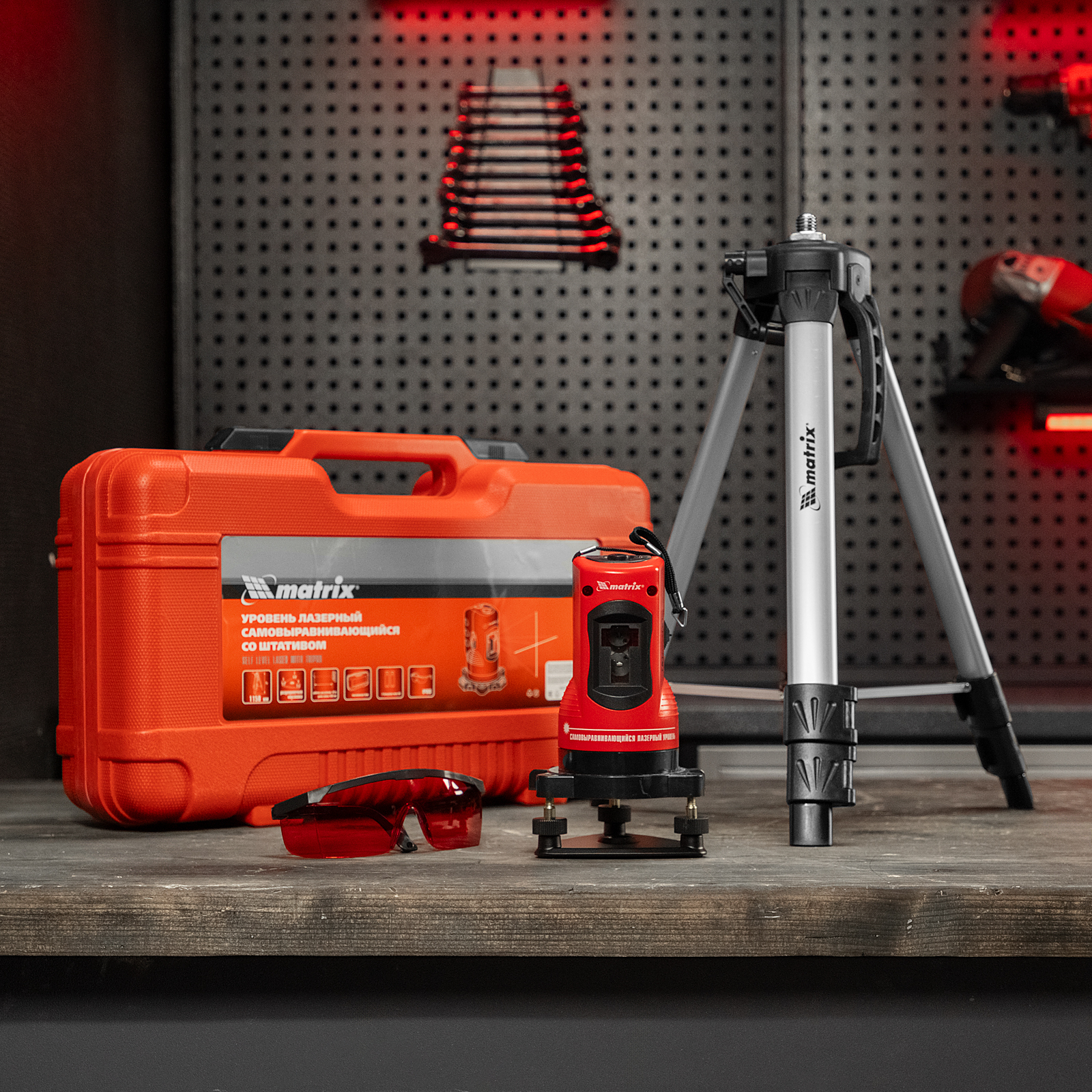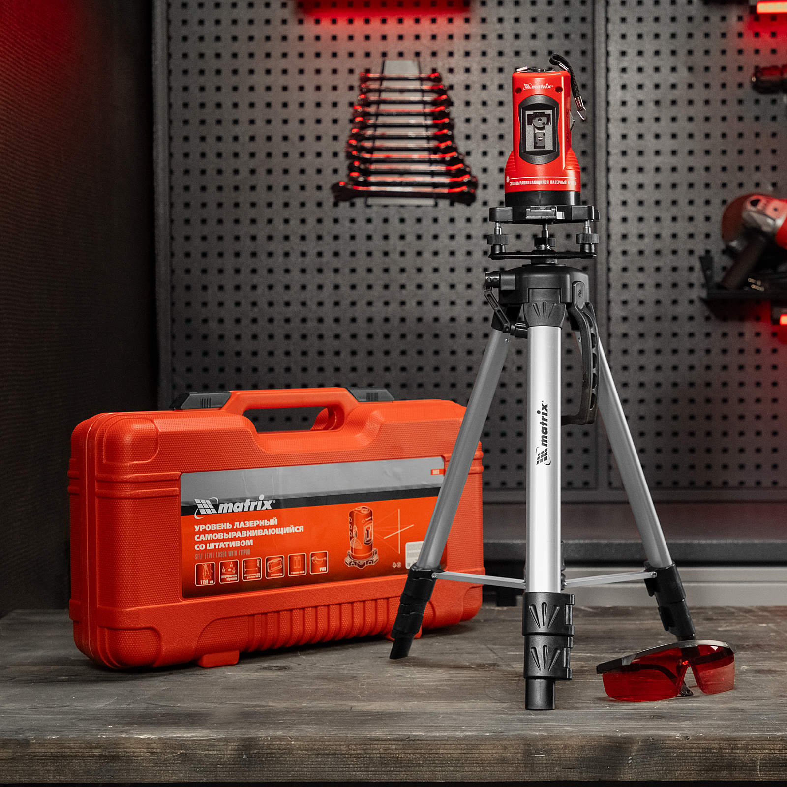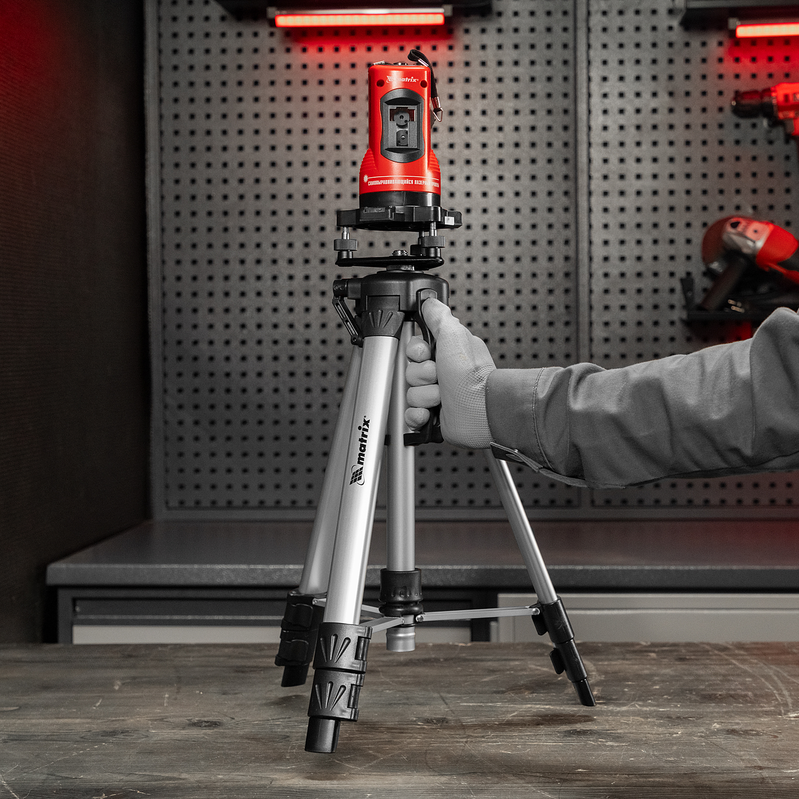 Самовыравнивающийся лазерный уровень Matrix 35033 размером 150 мм, поставляющийся в наборе со штативом 1150 мм в пластиковом кейсе, выстраивает проекции на плоскости: горизонталь, вертикаль или две сразу в виде креста. Инструмент облегчает проведение ремонтных, строительных, монтажных работ, декорирование помещений. Максимальная дальность проекции составляет 10 м, а лазерный луч одинаково хорошо виден в светлое и темное время суток, в помещениях и на улице.