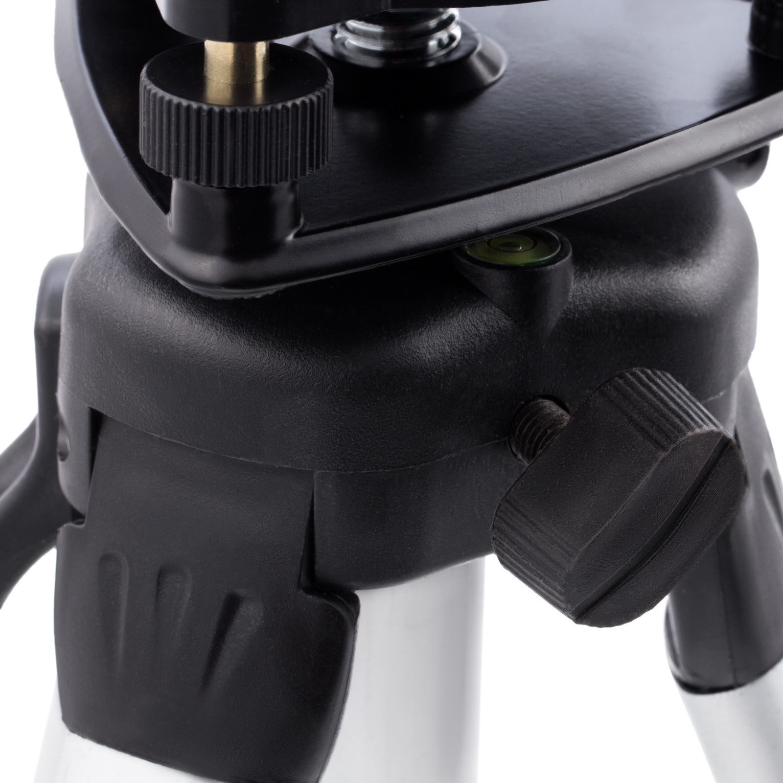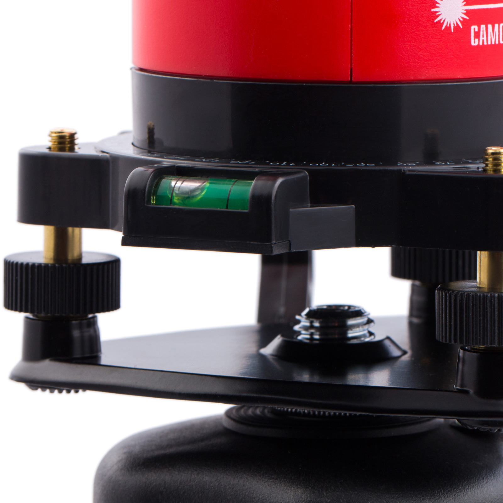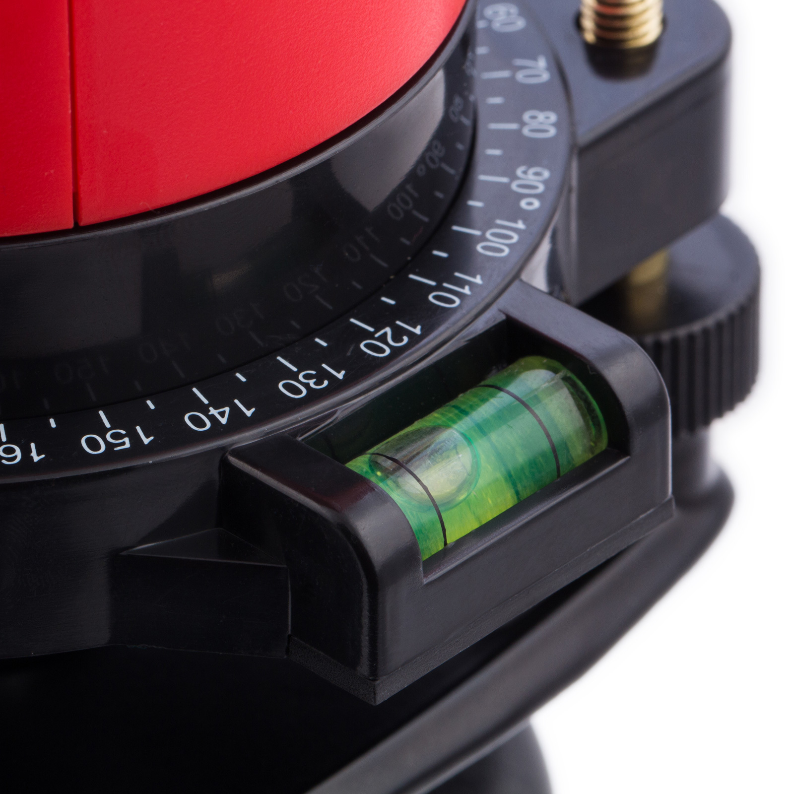 - Удобный штатив — уровень можно зафиксировать на высоте до 110 см, а благодаря поворотной площадке лазерные лучи можно направлять в нужную сторону.
