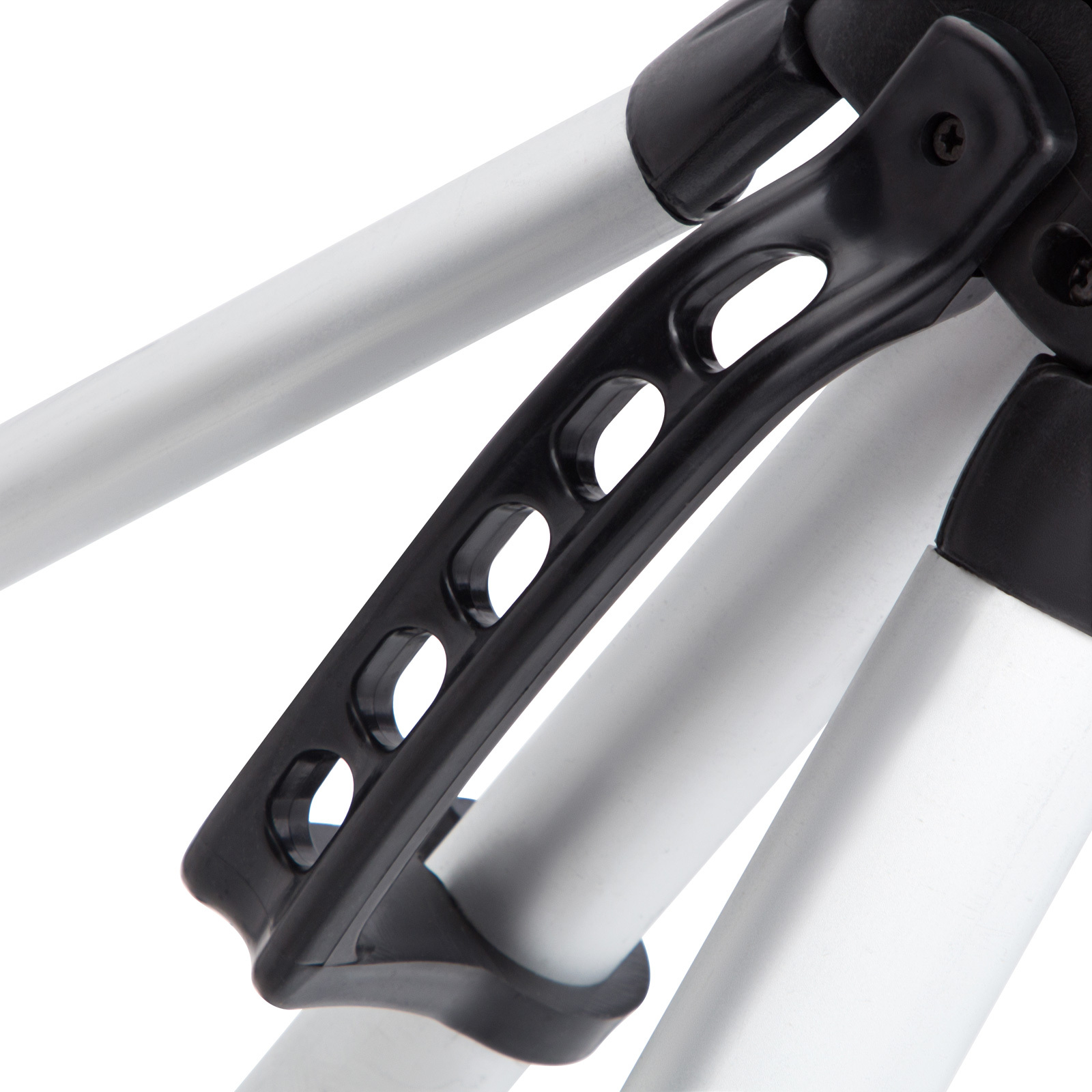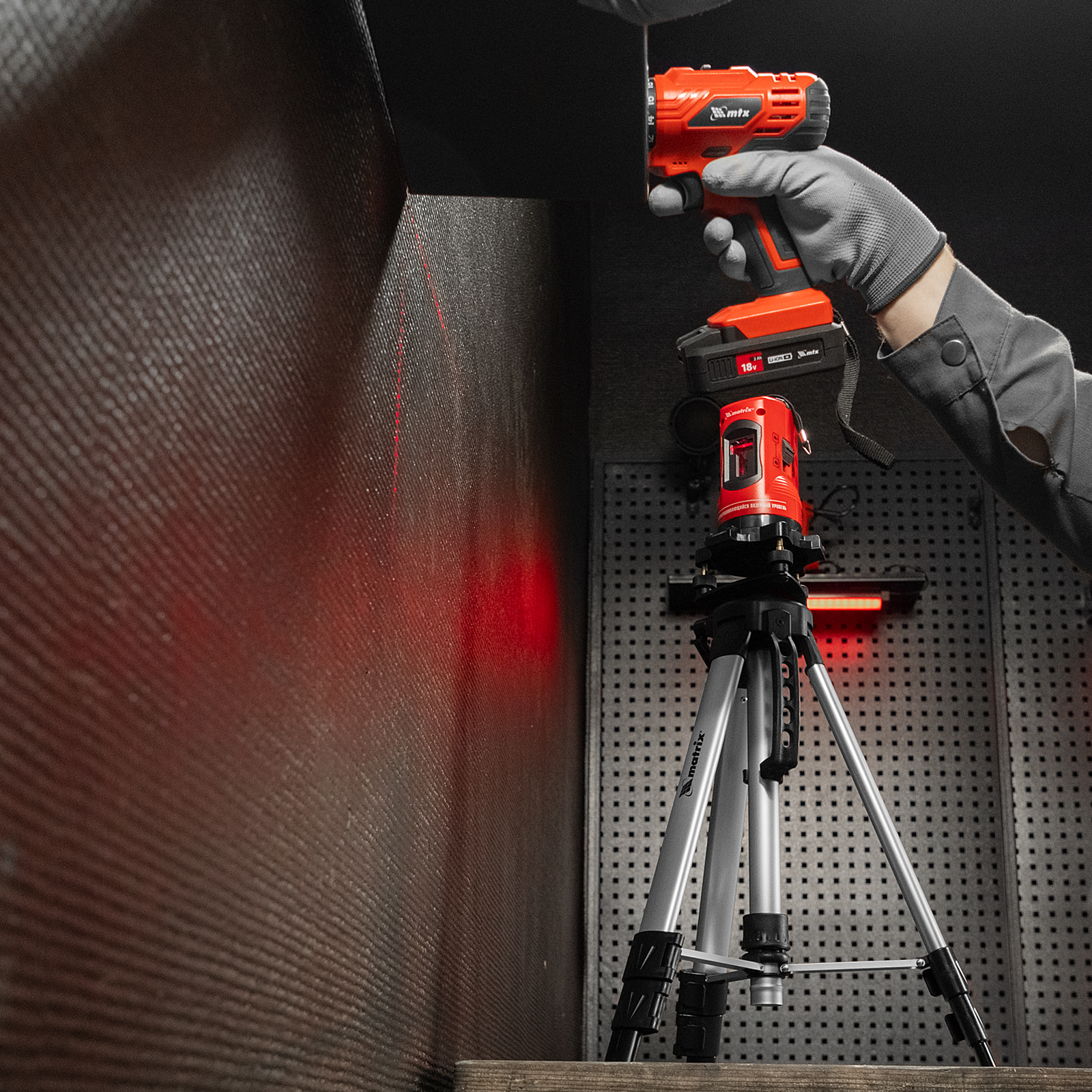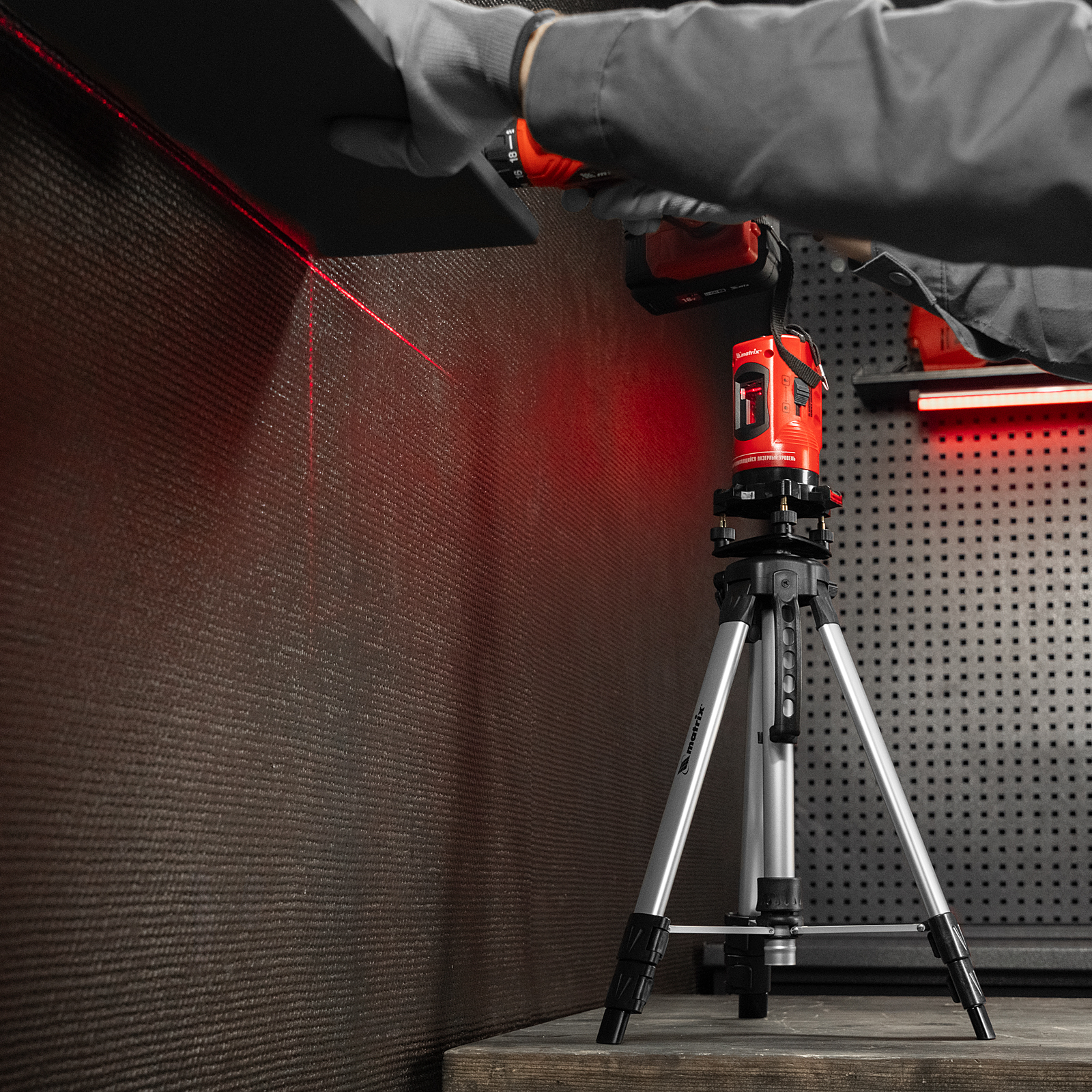 - Удобный штатив — уровень можно зафиксировать на высоте до 110 см, а благодаря поворотной площадке лазерные лучи можно направлять в нужную сторону.
