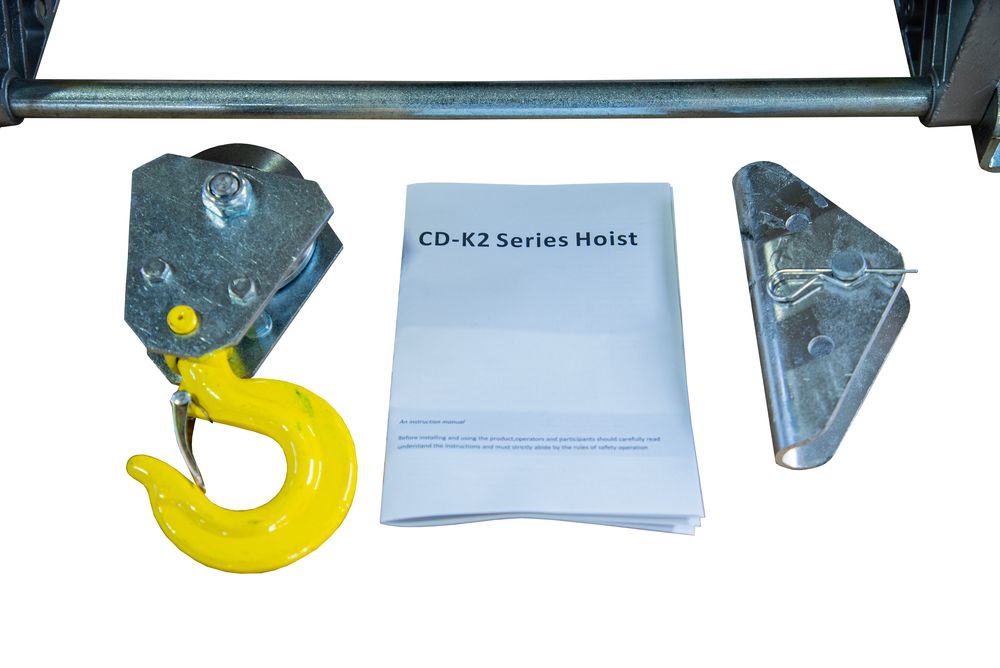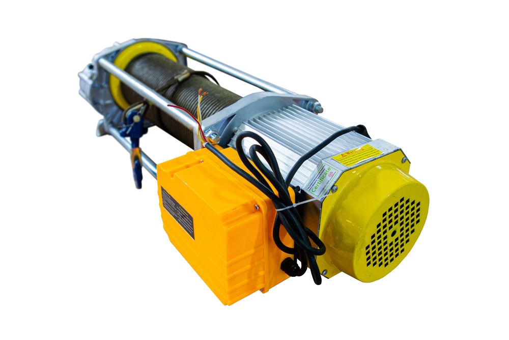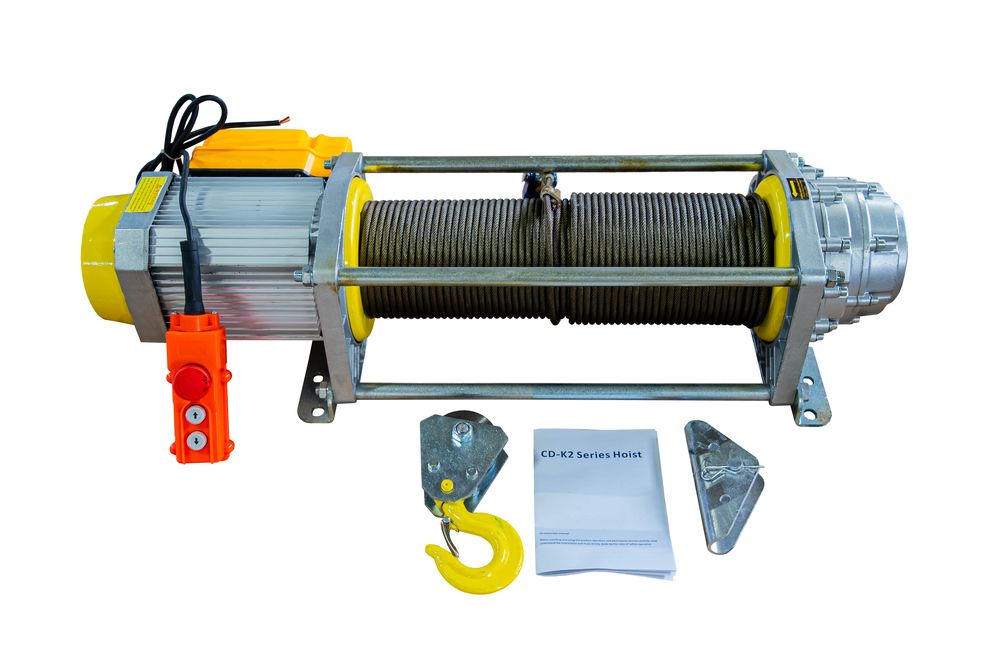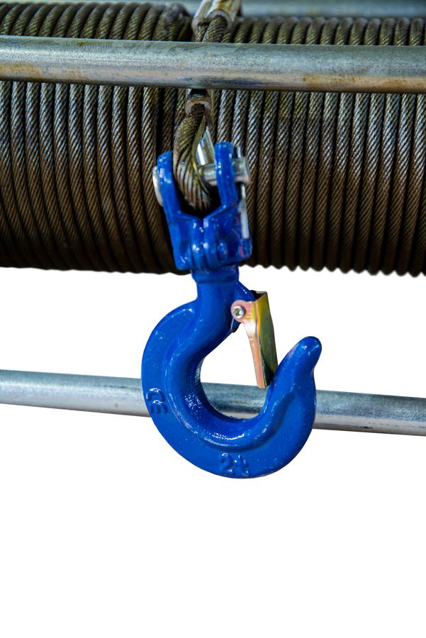 Лебедка комплектуется стальным тросом диаметром 8 мм длиной 30, 70 или 100 м, а также пультом управления и крюковой подвеской.