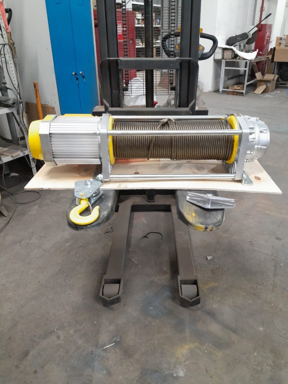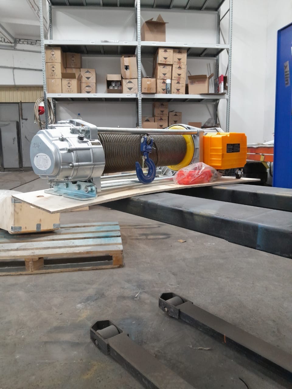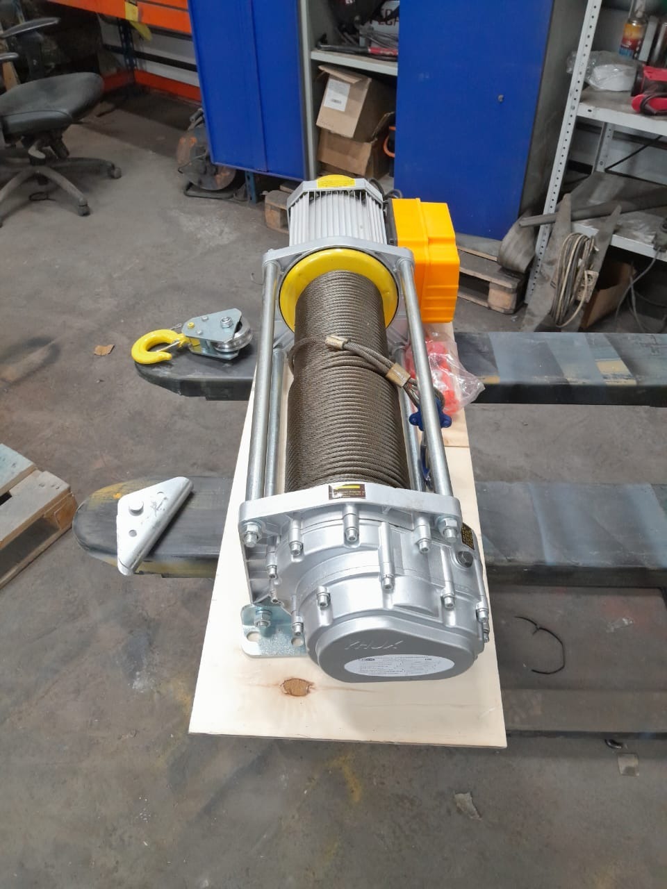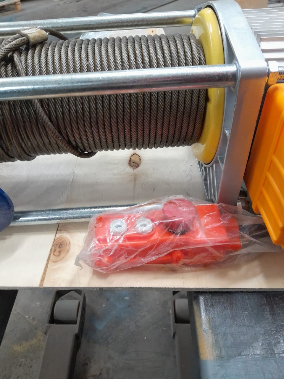 Лебедка комплектуется стальным тросом диаметром 8 мм длиной 30, 70 или 100 м, а также пультом управления и крюковой подвеской.