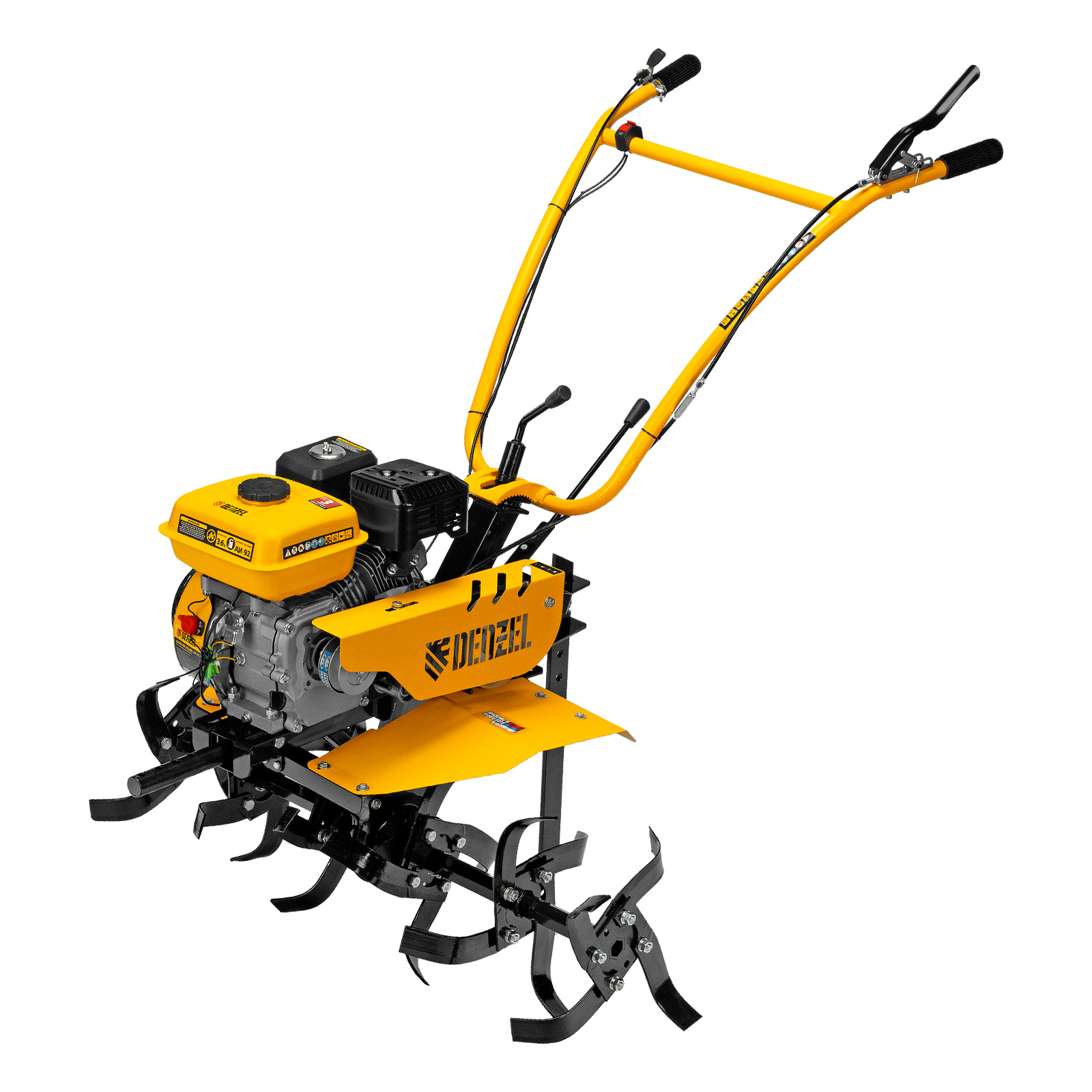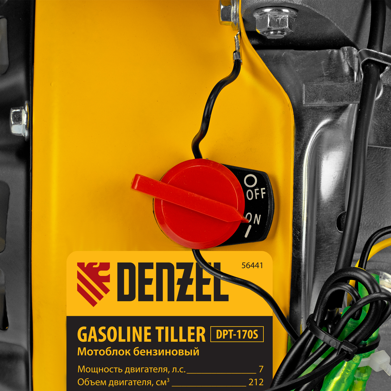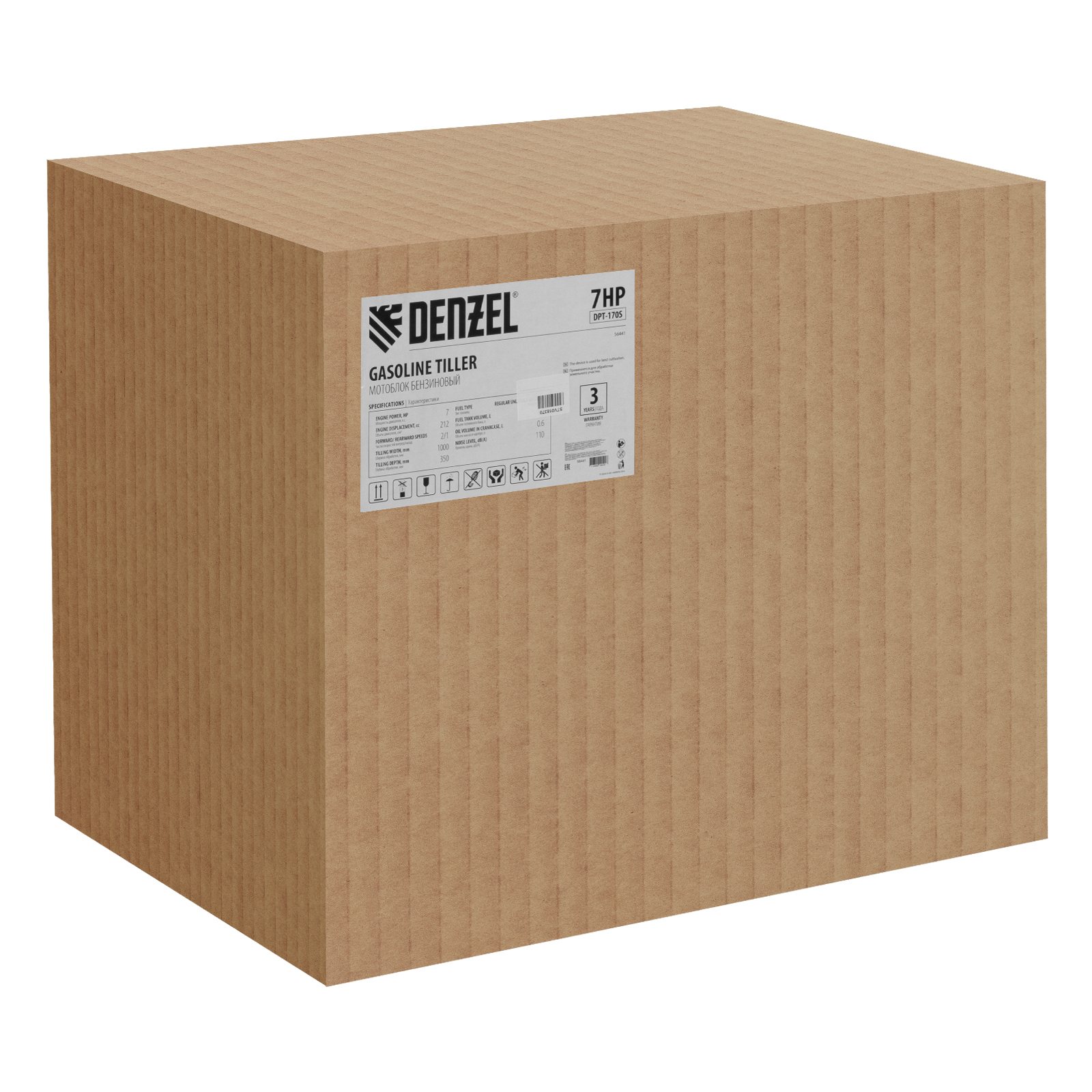 Мотоблок Denzel DPT-170S 56441 с двигателем мощностью 7 л. с., ременным механизмом сцепления, фрезами 3 х 4, шкивом отбора мощности (ШОМ) и коробкой передач 2В/1Н предназначен для проведения сельскохозяйственных работ. Максимальная ширина обработки составляет 1000 мм, глубина — 350 мм. Фрезы собираются из двух двойных и двух одинарных секций, что позволяет регулировать ширину вспашки. ,Шкив отбора мощности и универсальный кронштейн диаметром 30 мм позволяют установить любое навесное оборудование Denzel, например. плуг, окучник, картофелевыкапыватель. Такое решение значительно расширяет возможности мотоблока и позволяет минимизировать расходы на закупку сельскохозяйственной техники.