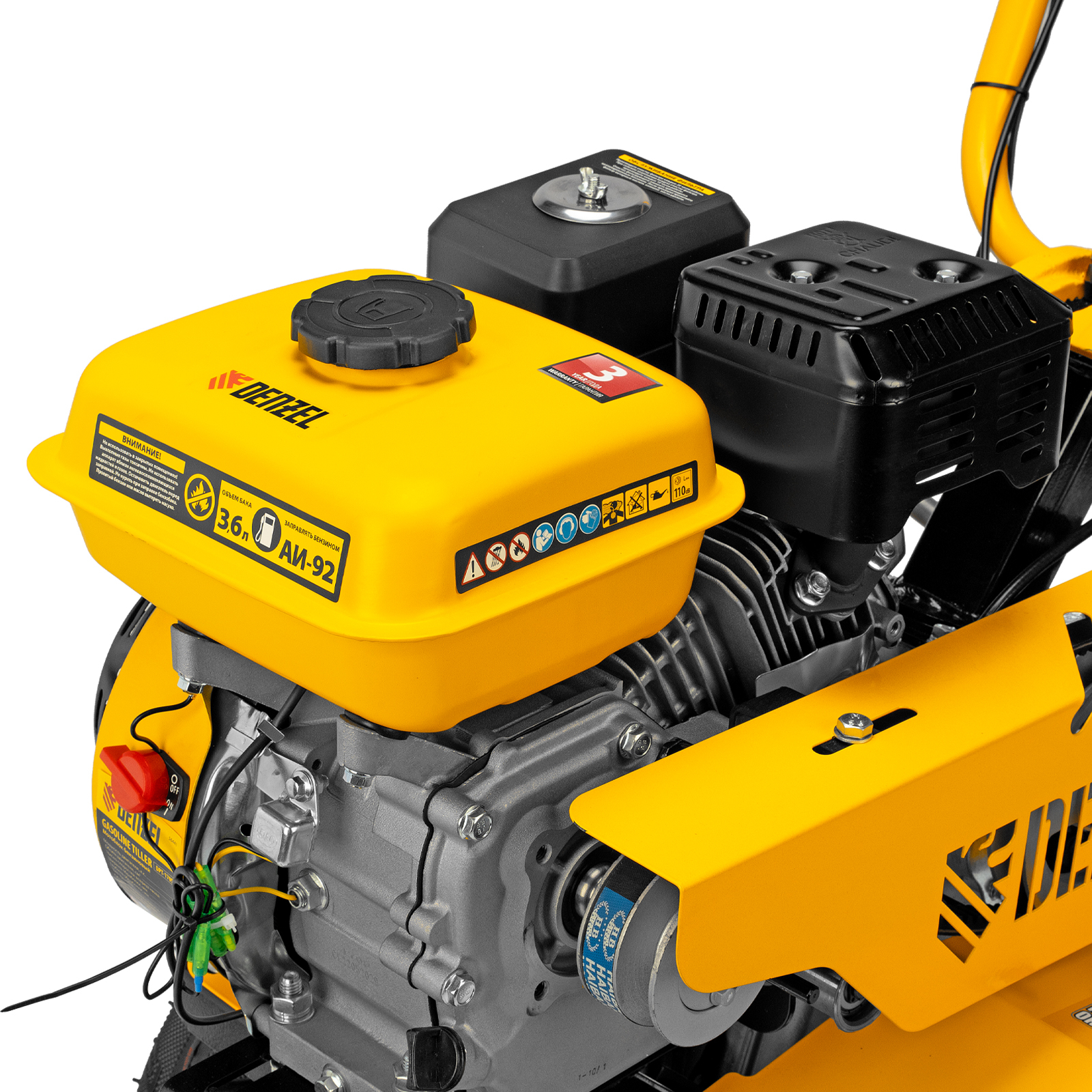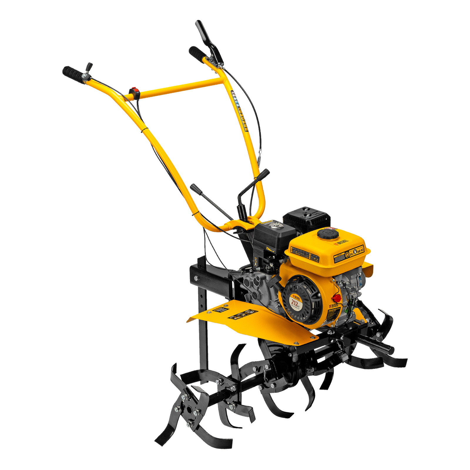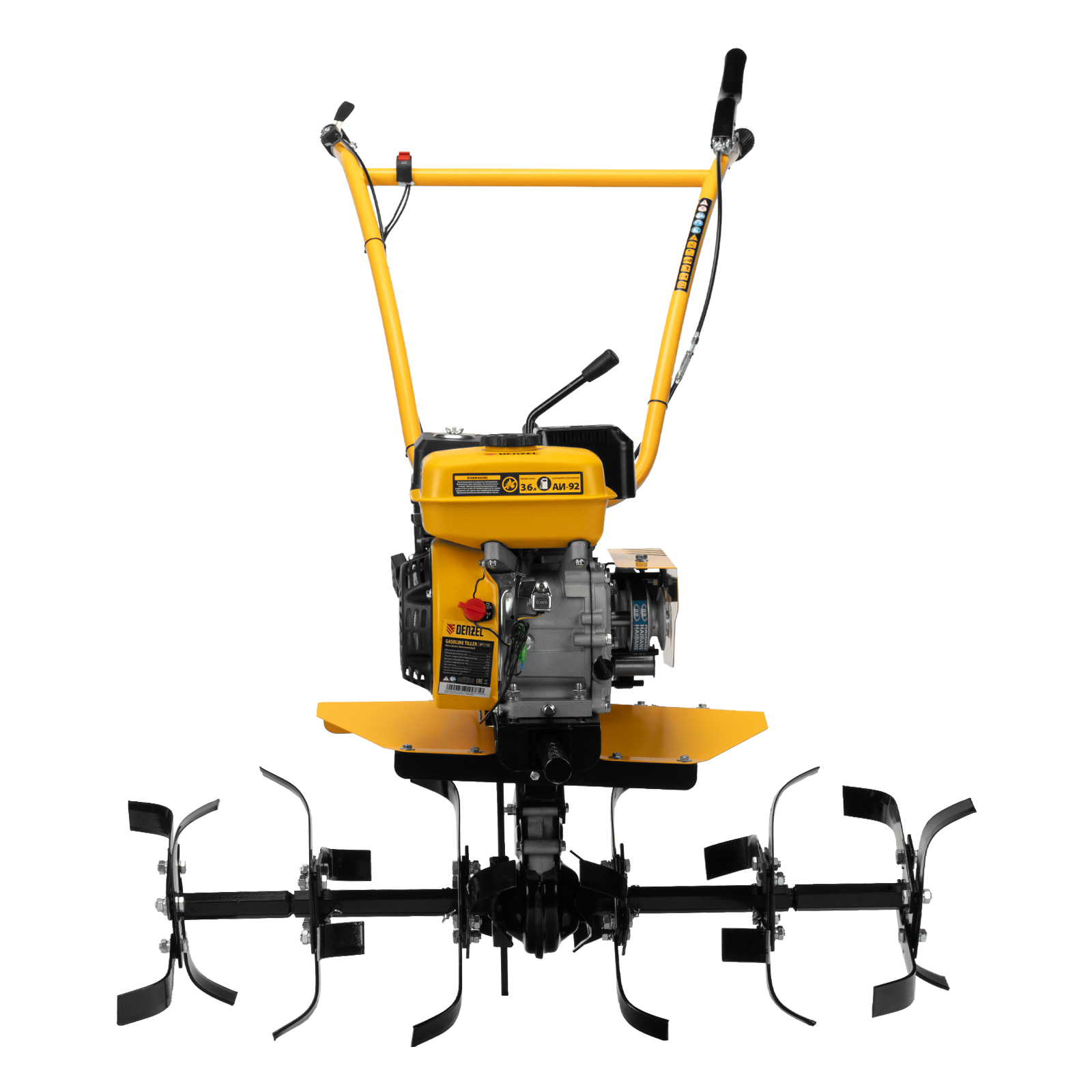 Мотоблок Denzel DPT-170S 56441 с двигателем мощностью 7 л. с., ременным механизмом сцепления, фрезами 3 х 4, шкивом отбора мощности (ШОМ) и коробкой передач 2В/1Н предназначен для проведения сельскохозяйственных работ. Максимальная ширина обработки составляет 1000 мм, глубина — 350 мм. Фрезы собираются из двух двойных и двух одинарных секций, что позволяет регулировать ширину вспашки. ,Шкив отбора мощности и универсальный кронштейн диаметром 30 мм позволяют установить любое навесное оборудование Denzel, например. плуг, окучник, картофелевыкапыватель. Такое решение значительно расширяет возможности мотоблока и позволяет минимизировать расходы на закупку сельскохозяйственной техники.