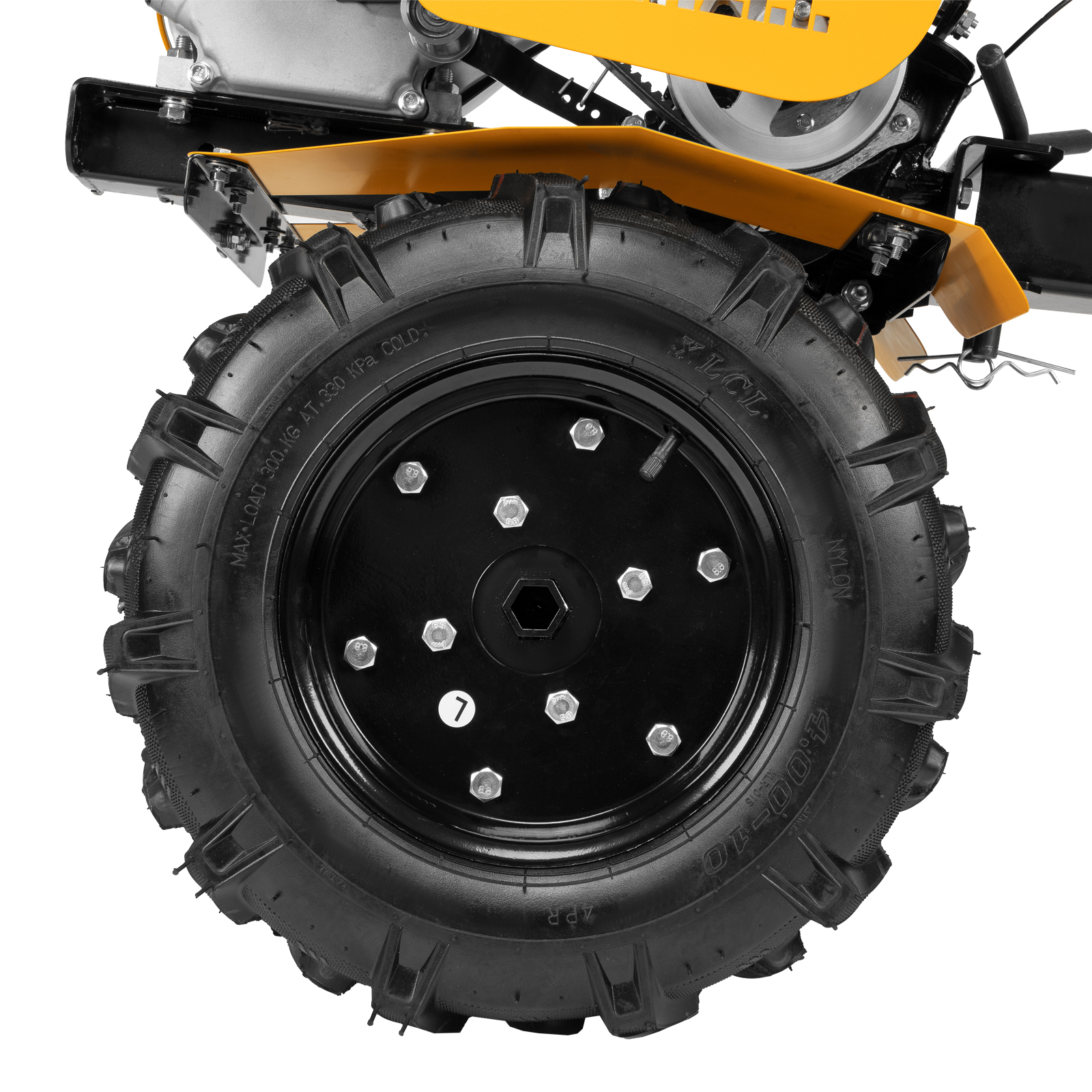 - Свобода движений — большие пневматические колеса входят помогают перевозить мотоблок в нужное место даже по неровной земле и не боятся повреждений.