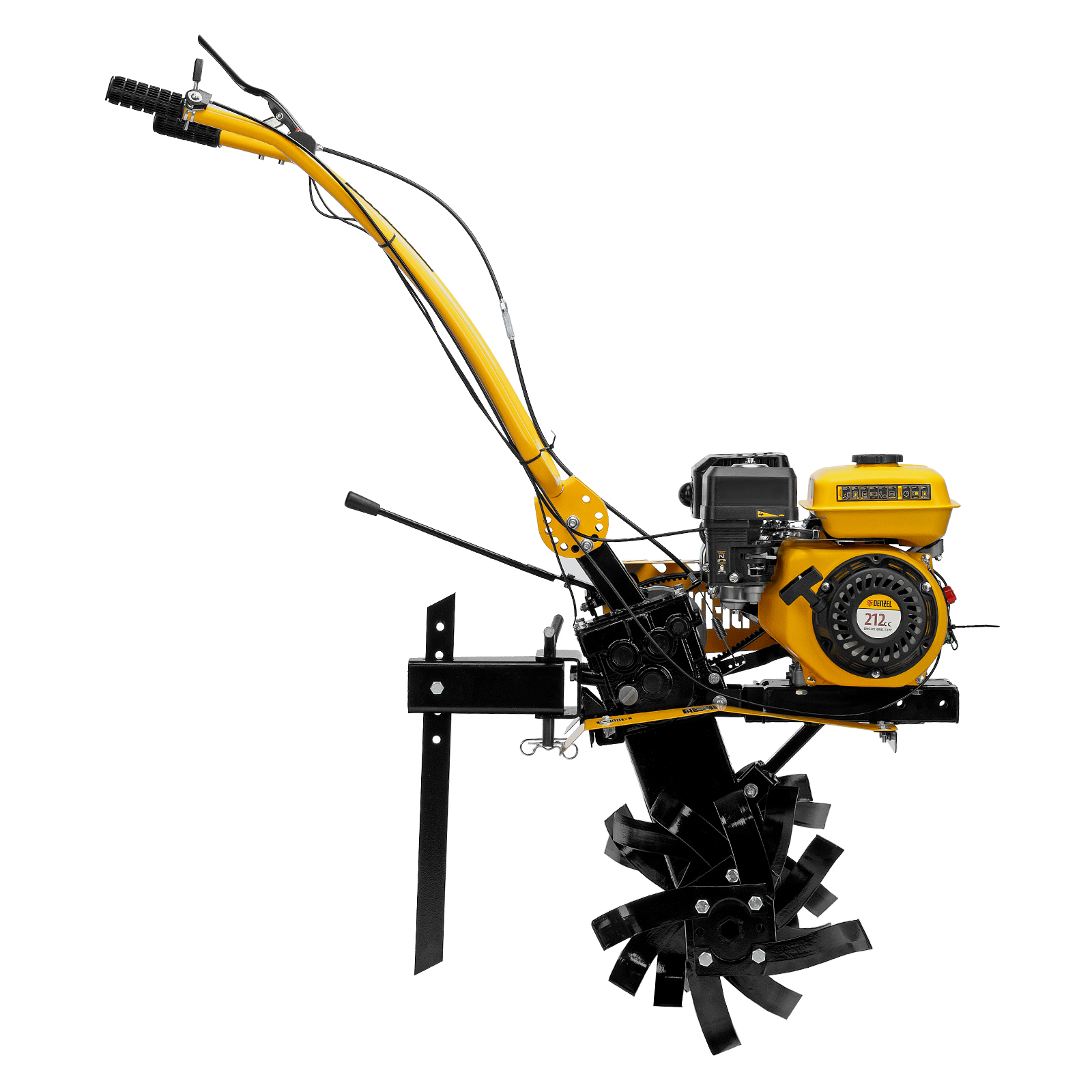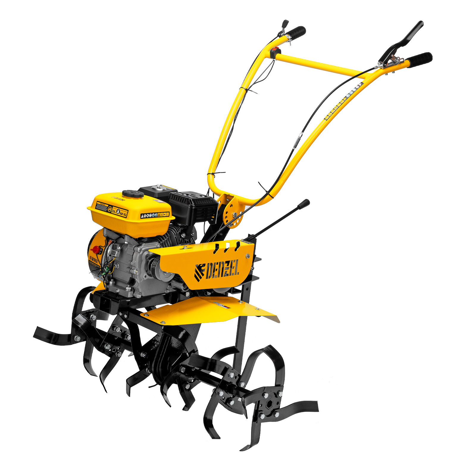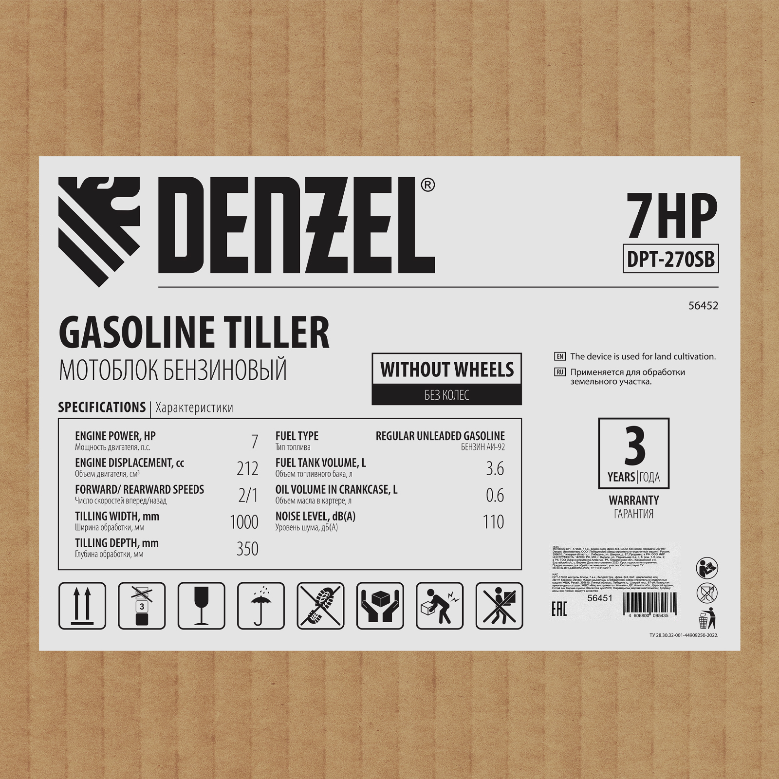Мотоблок Denzel DPT-270SB 56452 мощностью 7 л.с., с ременным механизмом сцепления, оснащен фрезами 3 х 4, шкивом отбора мощности (ШОМ) и коробкой передач 2В/1Н. Предназначен для выполнения земляных работ: рыхления, вспахивания, прополки и т. д. Успешно справляется даже с плотной, глинистой почвой. Разборные фрезы с дополнительными секциями позволяют регулировать ширину обработки до 1 м.,Чугунный шестеренчато-цепной редуктор позволяет работать длительное время с большими нагрузками, шкив отбора мощности и кронштейн диаметром 30 мм позволяют подключать активное навесное оборудование. При помощи универсальной сцепки мотоблок агрегатируется с различным навесным оборудованием Denzel: плугом, окучником, картофелевыкапывателем (совместимые артикулы 59905, 59911, 59906, 59907, 59912, 59908, 59913). Тем самым можно сократить расходы на приобретение сельскохозяйственной техники. Повысить проходимость можно при помощи грунтозацепов 59901, 59914, 59915, 59916, 59917. Установка прицепа Denzel 59950 позволяет использовать мотоблок для перемещения по участку и транспортировки грузов.