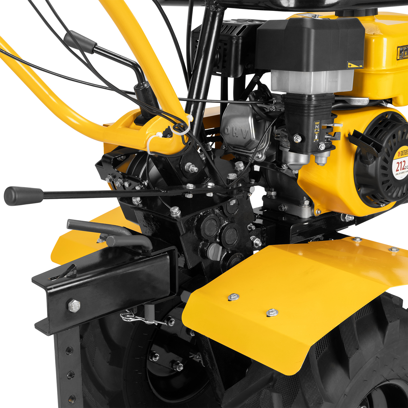 Передний кронштейн диаметром 30 мм позволяет размещать навесное оборудование: грунтозацепы, удлинители осей, картофелевыкапыватель, окучник, плуг или другое. Это позволяет существенно расширить возможности мотоблока и избежать дополнительных расходов на приобретение сельскохозяйственной техники. Мотоблок совместим со всеми моделями навесного оборудования, представленными в ассортименте Denzel (приобретаются отдельно).