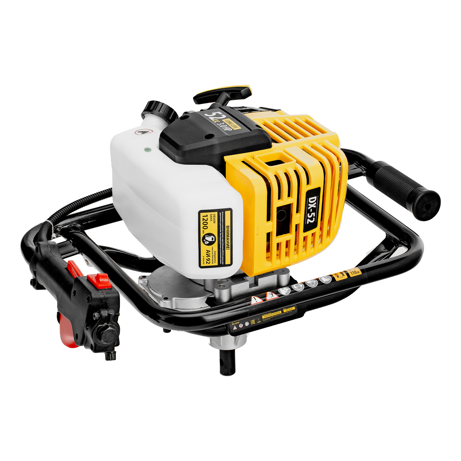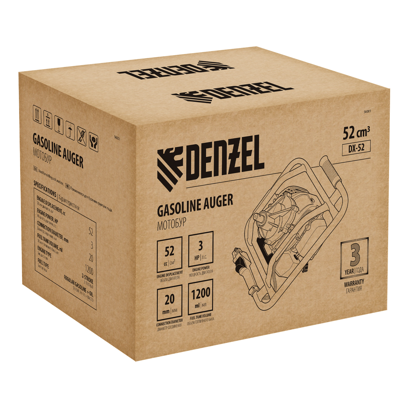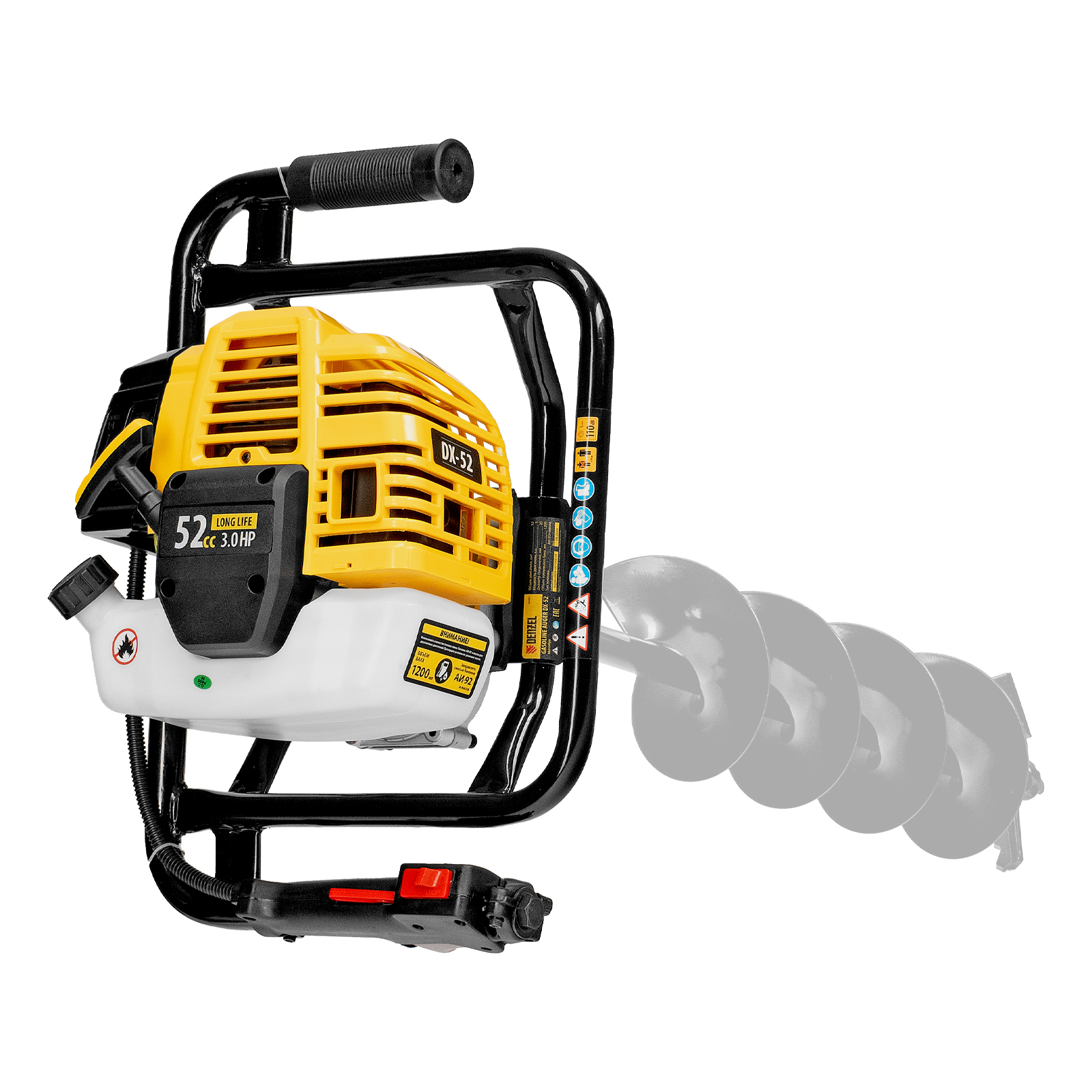 Мотобур Denzel DX-52 56001 с объемом двигателя 52 см3 и диаметром соединения 20 мм предназначен для получения отверстий и углублений во льду или в грунте максимальным диаметром 300 мм. Мощный и экономичный двигатель мощностью 3 л. с. позволяет эффективно решать поставленные задачи. Для бурения отверстий диаметром более 150 мм и глубиной более 1 м предусмотрена возможность управления мотобуром двумя пользователями. Устройство будет полезно на строительной площадке, загородном участке, пригодится также во время зимней рыбалки.