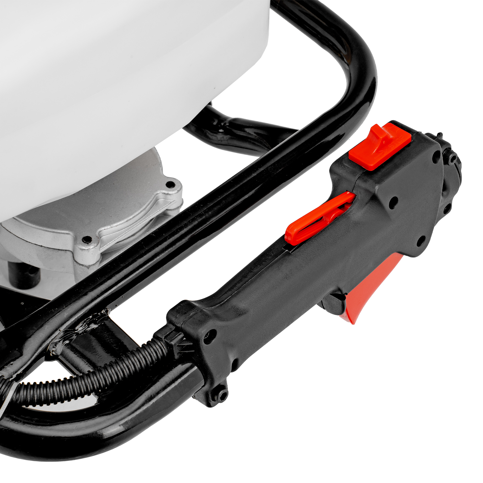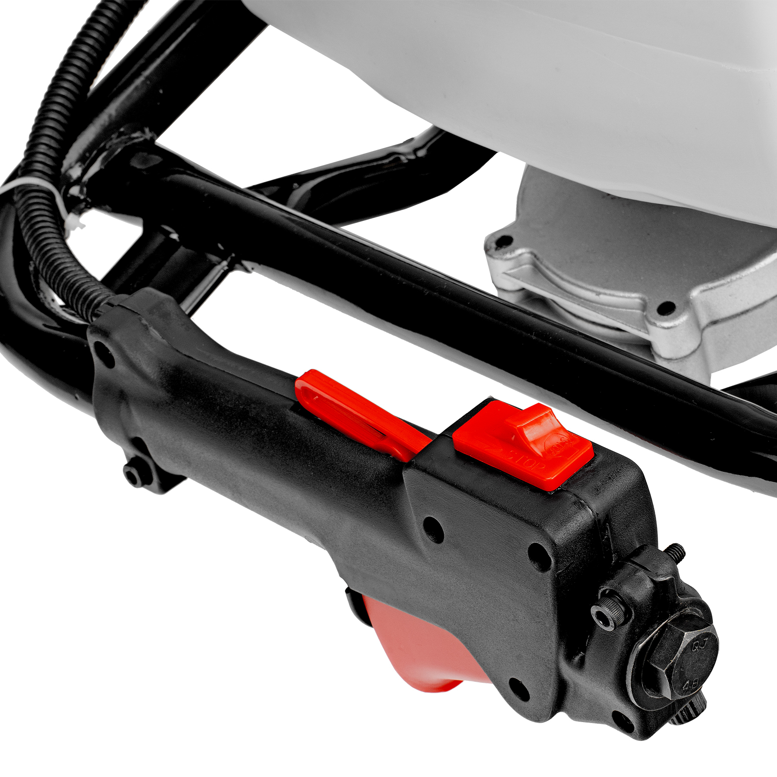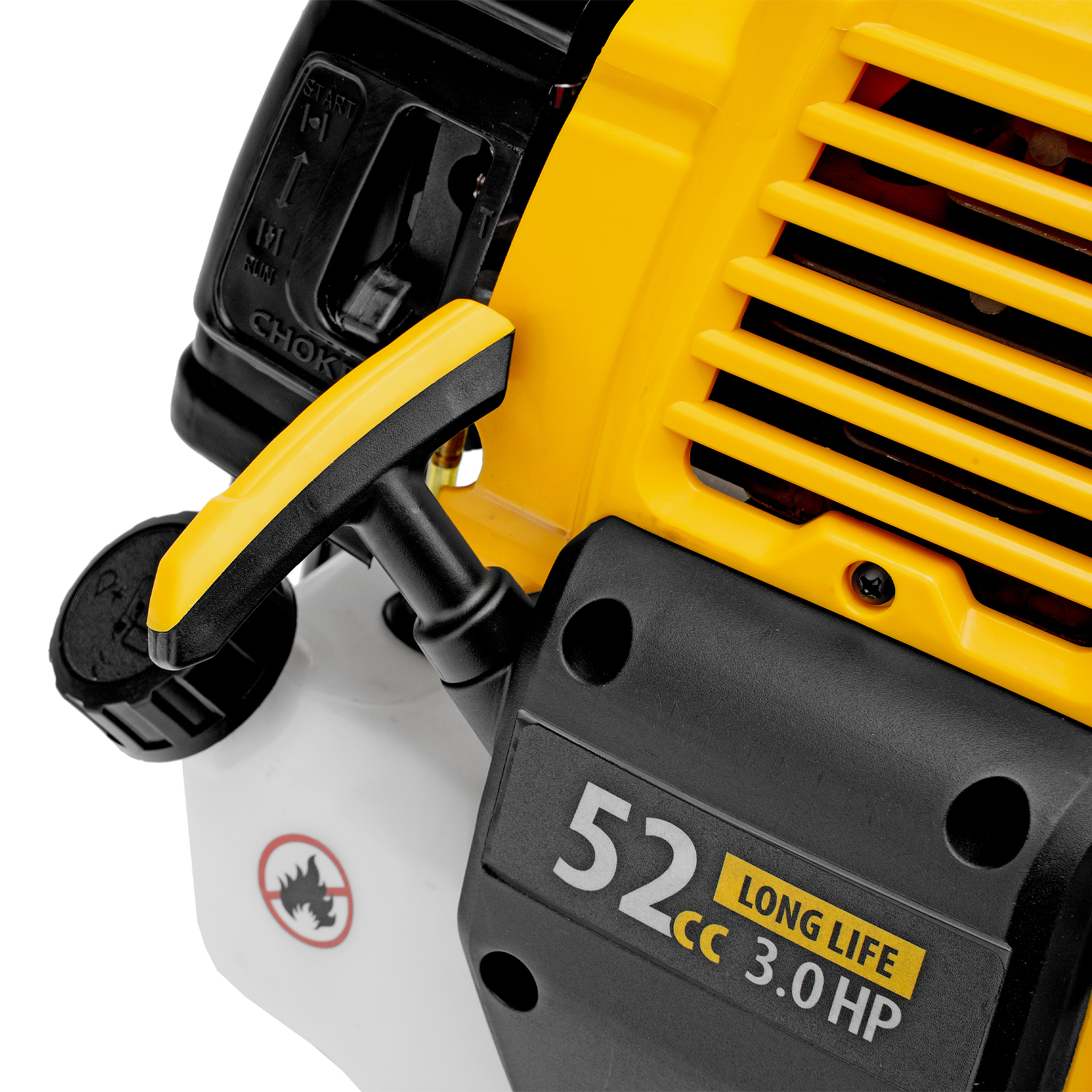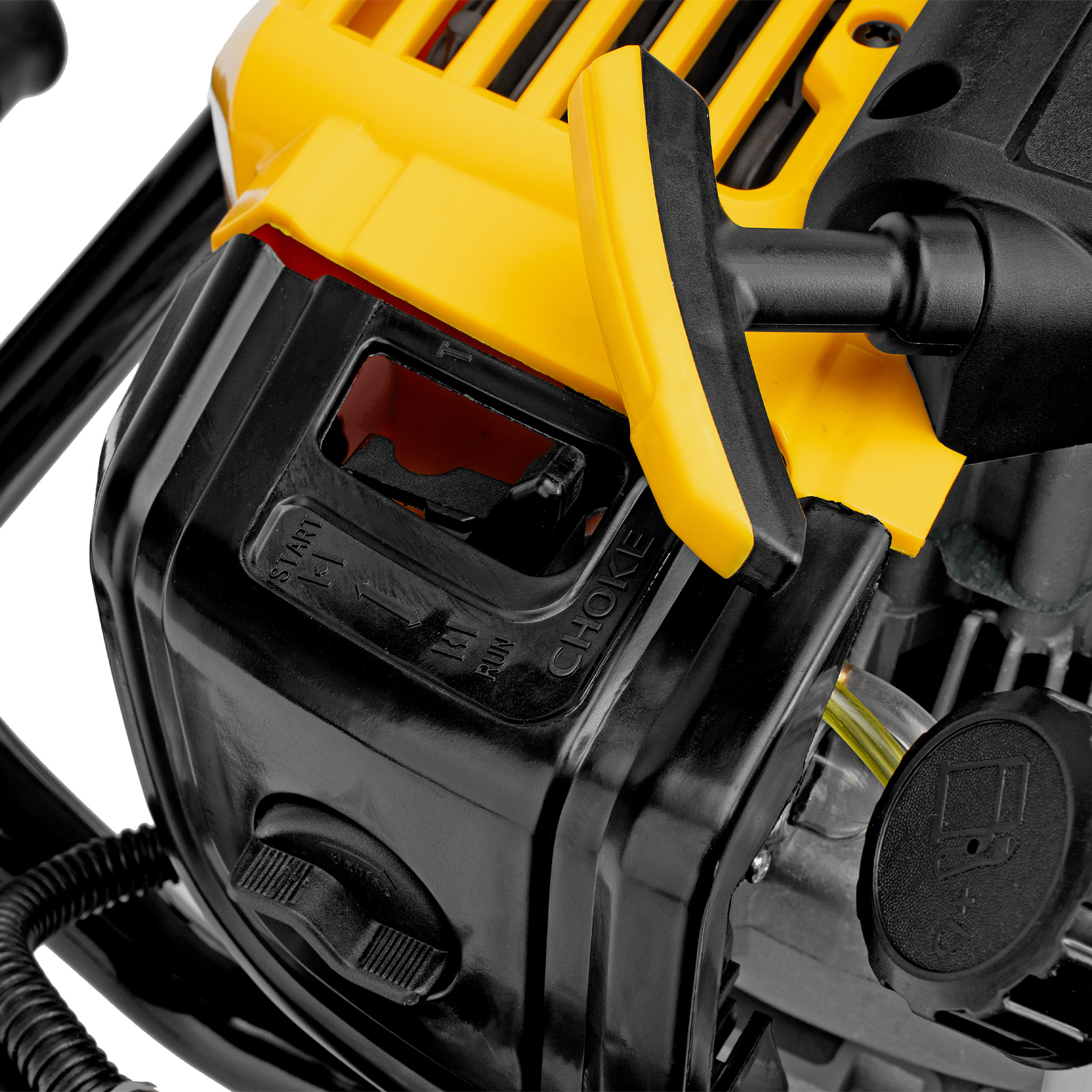 - Удобное управление — выключатель зажигания и курок газа расположены на правой рукоятке.