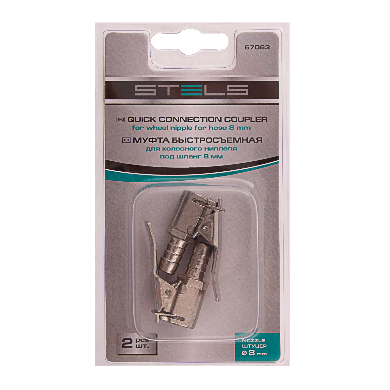 Быстросъемная муфта Stels 57063 со штуцером «елка», 2 шт. в упаковке, предназначена для быстрого соединения шланга диаметром 8 мм с колесным ниппелем для подкачки шин. Пригодится в поездке и в гараже.