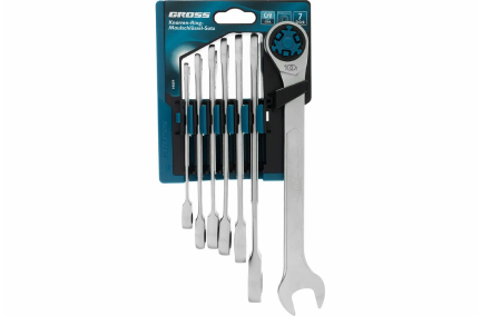 Набор комбинированных трещоточных ключей Gross 14859 включает в себя 7 инструментов из стали CrV и используется для монтажа и демонтажа резьбовых соединений диаметром от 8 до 19 мм. Ключи имеют как рожковую, так и накидную часть, что повышает их функциональность. У накидной части 12 внутренних граней, что увеличивает площадь соприкосновения с головкой крепежа и снижает риск ее деформации. Ключи применяются как в автосервисах, так и для самостоятельного ремонта автомобилей.