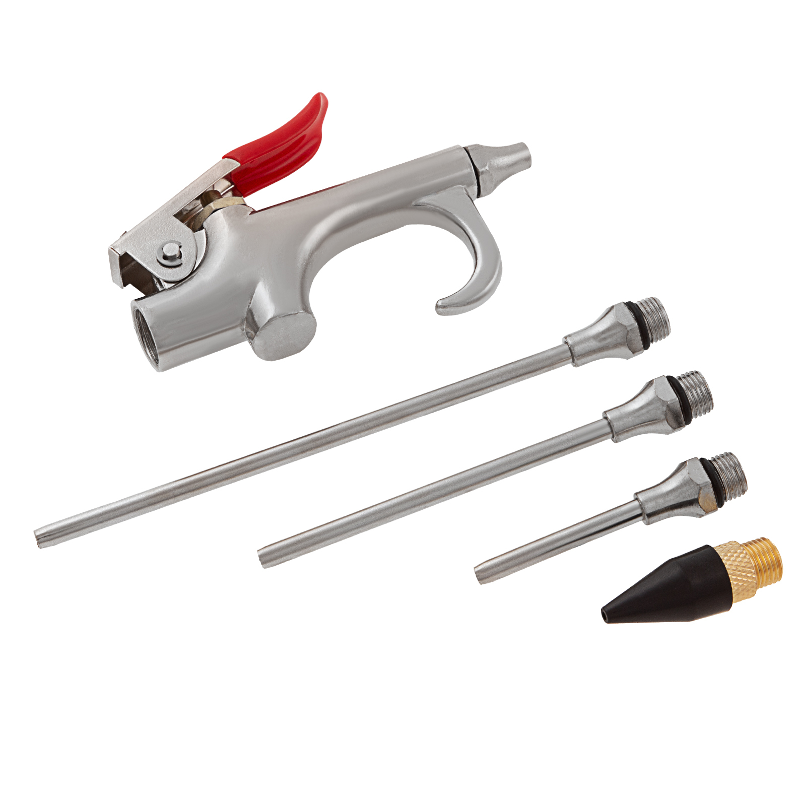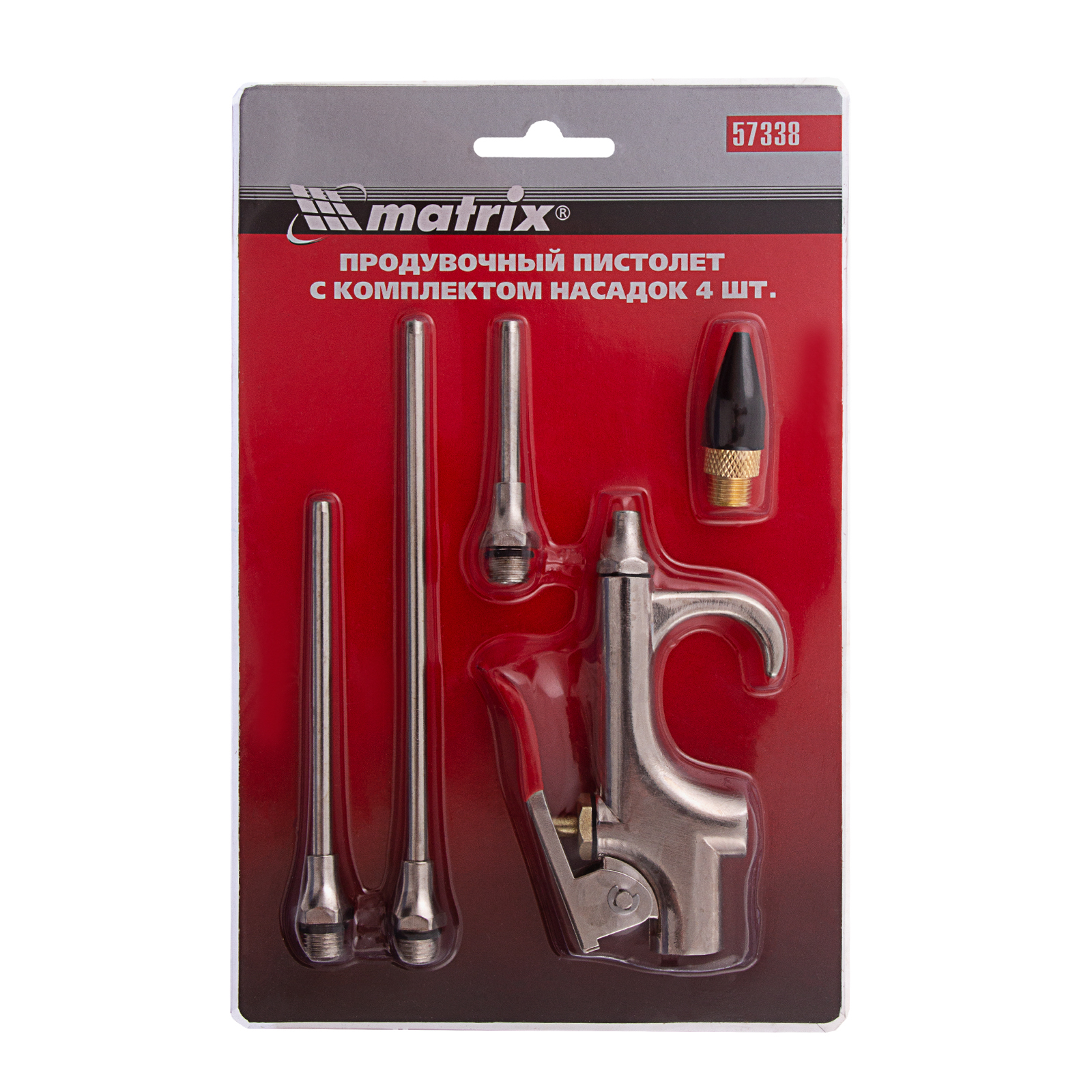 Набор продувочный Matrix 57338 включает в себя пневматический пистолет и 4 насадки-сопла для работы как с небольшими, так и глубокими отверстиями, а также для обработки больших поверхностей. Струя сжатого до 6 бар воздуха выходит со скоростью до 400 л/мин, что позволяет использовать пистолет в быту, во время ремонта и строительства, в автосервисах и небольших мастерских.