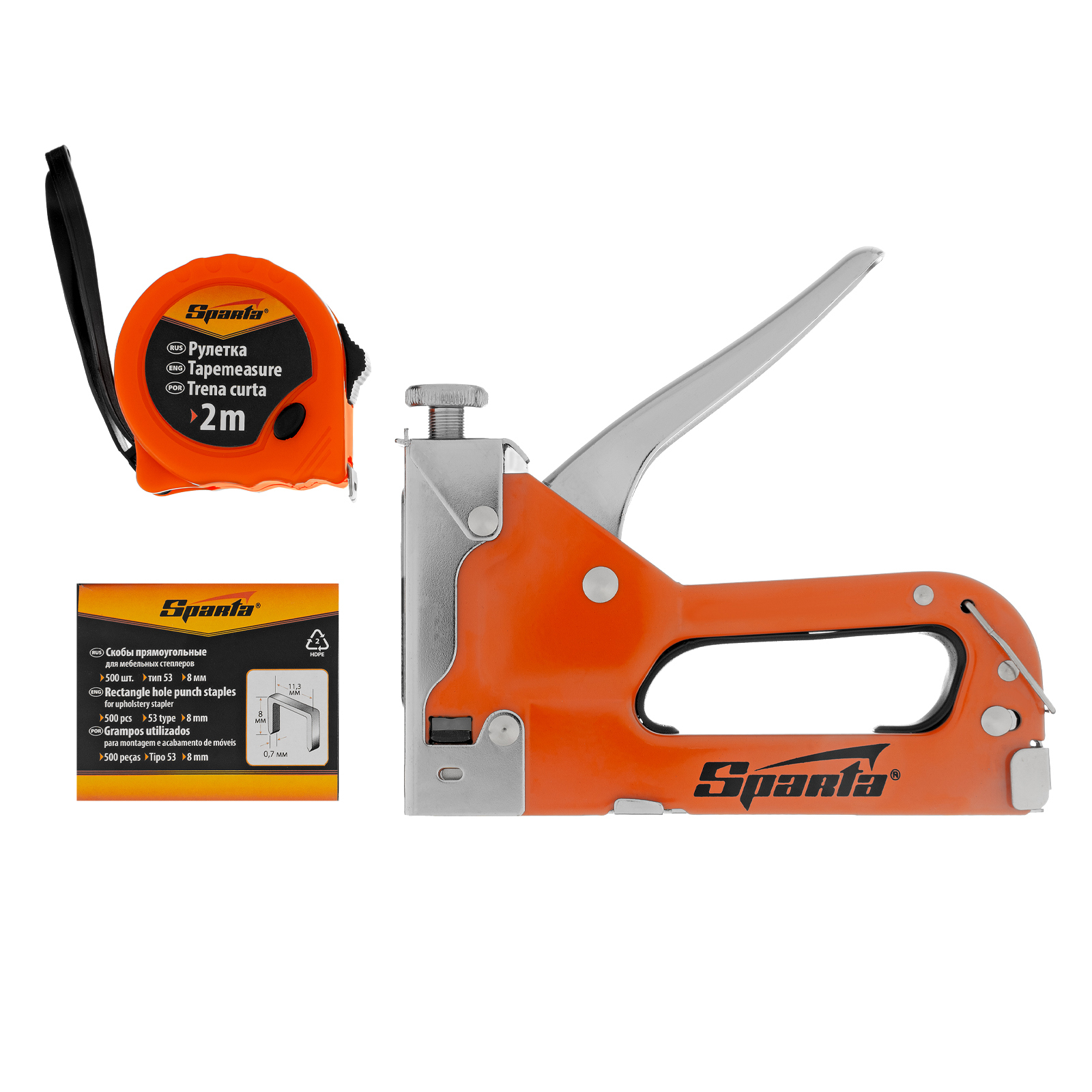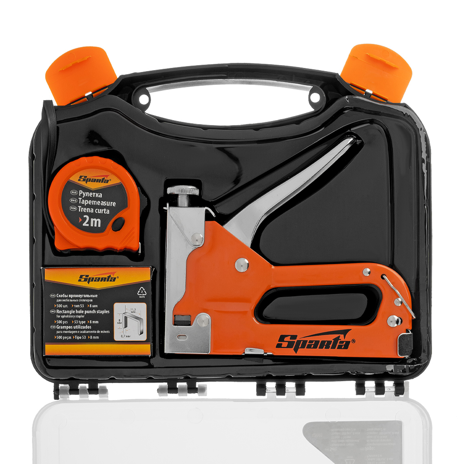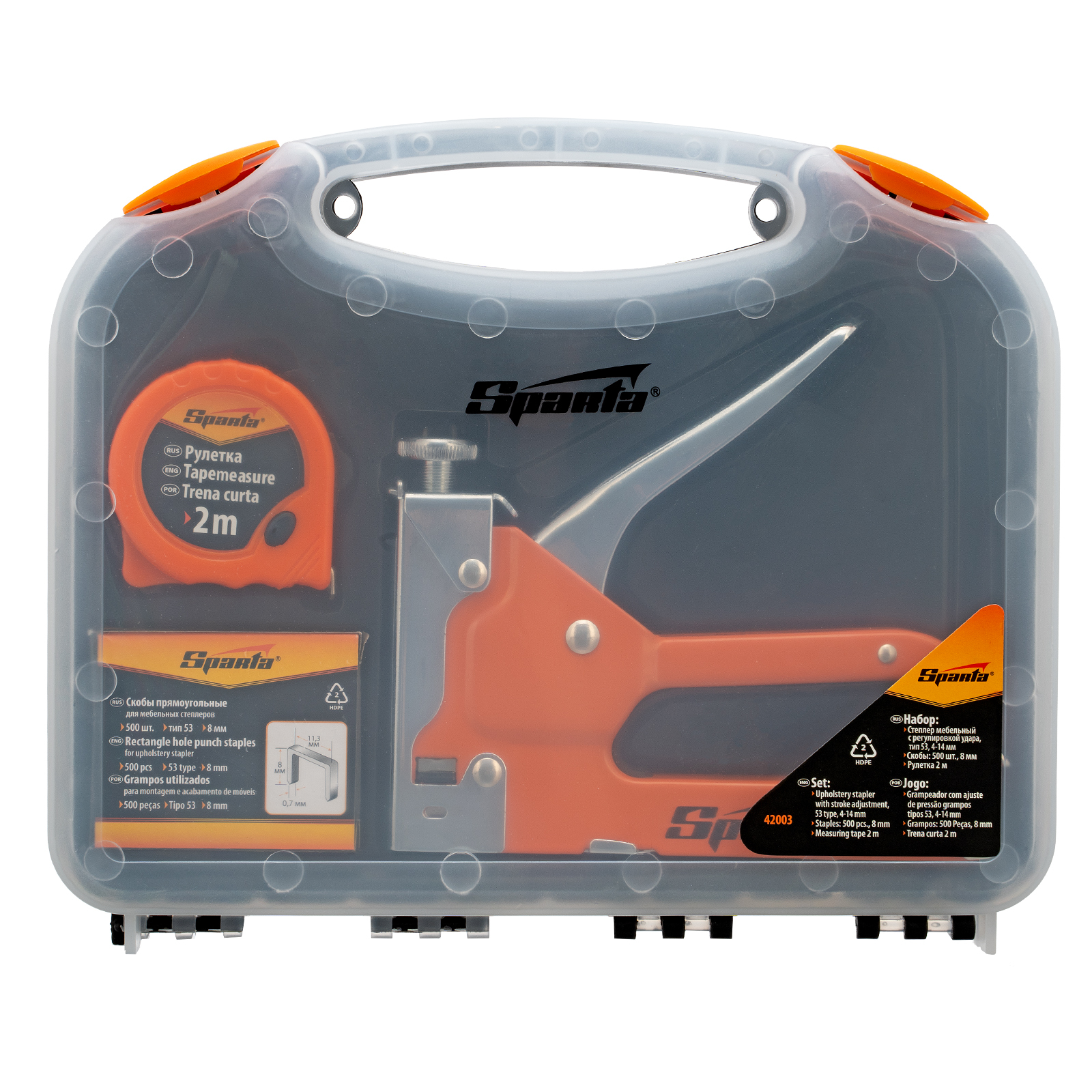 Набор Sparta 42003 состоит из мебельного регулируемого степлера, совместимого с крепежом типа 53 размером 4-14 мм, 500 скоб и рулетки с длиной ленты 2 м. Инструменты позволяют измерять и закреплять на деревянном основании оргалит, фанеру, ДСП, ДВП, пленку, утеплитель и другие листовые материалы. Набор будет полезен для сборки и перетяжки мебели, укладки напольных покрытий и монтажа теплоизоляционного материала. Подходит для бытового применения.
