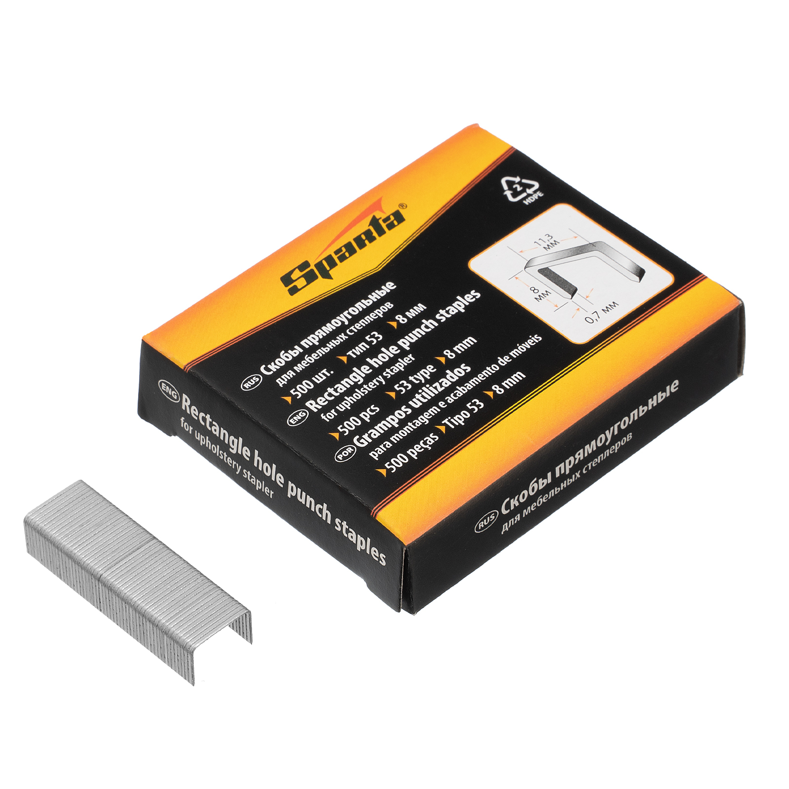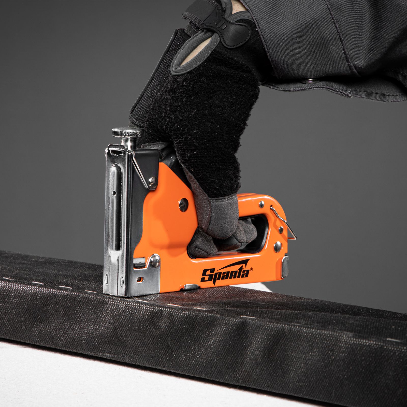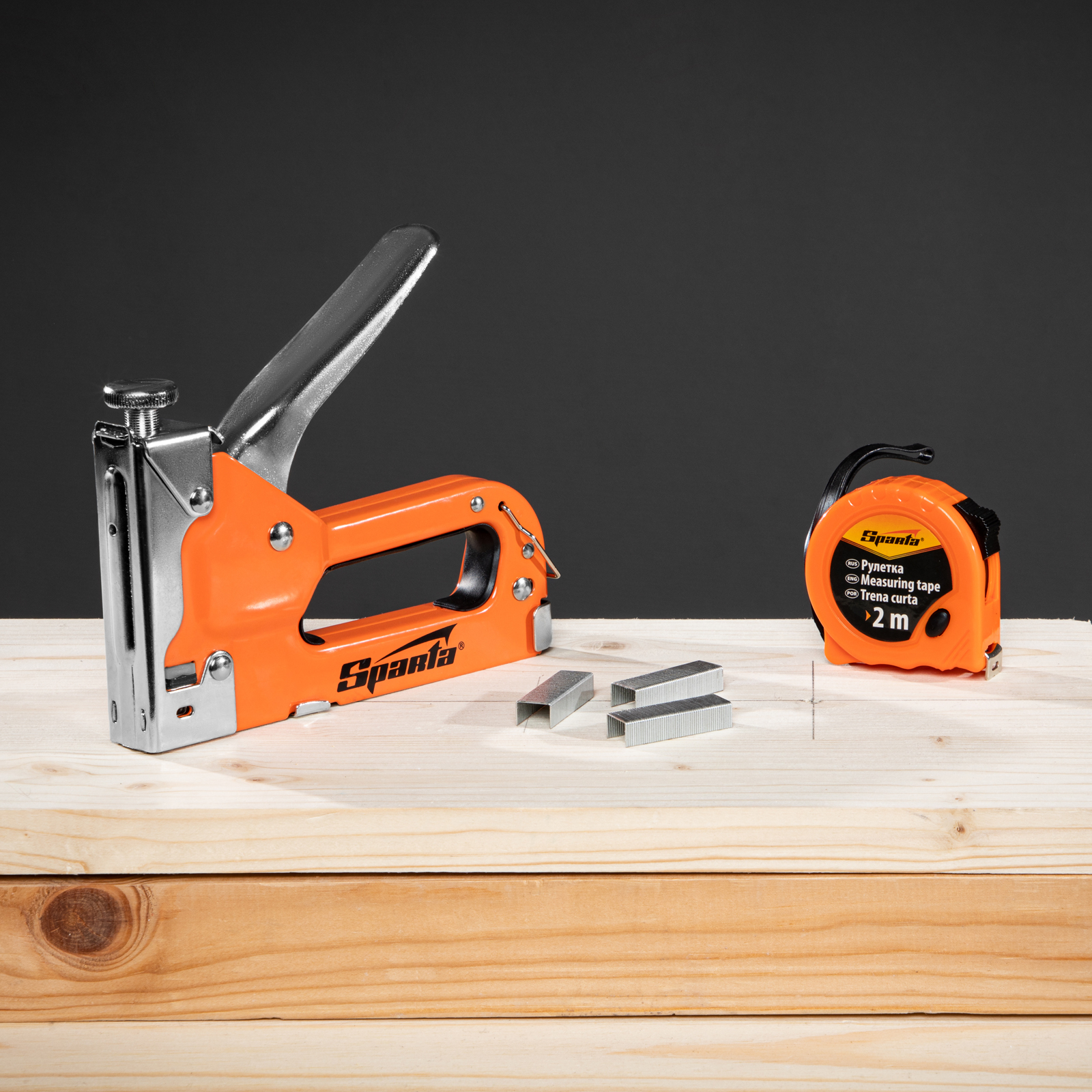 Набор Sparta 42003 состоит из мебельного регулируемого степлера, совместимого с крепежом типа 53 размером 4-14 мм, 500 скоб и рулетки с длиной ленты 2 м. Инструменты позволяют измерять и закреплять на деревянном основании оргалит, фанеру, ДСП, ДВП, пленку, утеплитель и другие листовые материалы. Набор будет полезен для сборки и перетяжки мебели, укладки напольных покрытий и монтажа теплоизоляционного материала. Подходит для бытового применения.