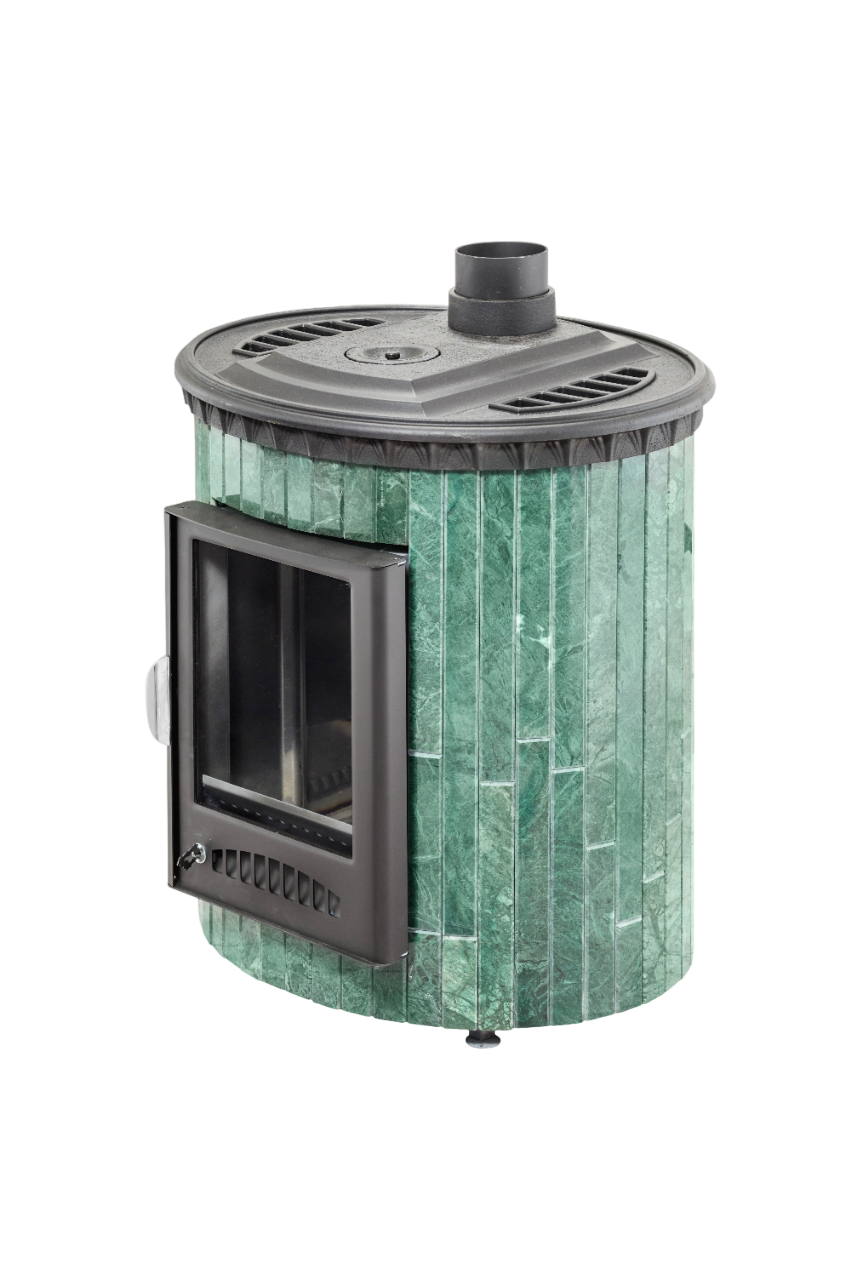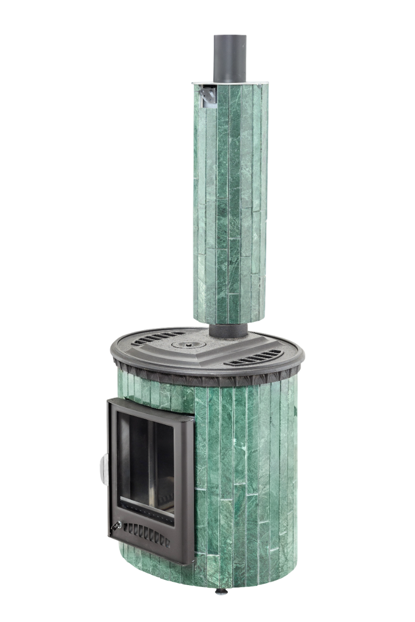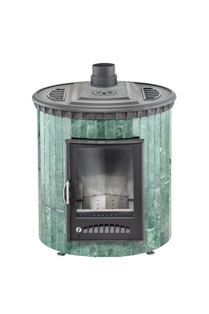 Топка печи «Нелжа» изготовлена из стали марки AISI 439. Преимущества этого сплава – высокая жаростойкость и неподверженность коррозии. Дверца топки имеет широкую вставку из огнеупорного стекла. Горячую зону топки огибает резервуар, в который можно заложить до 60 кг камней. Активное горение дров в печи продолжается несколько часов. В это время каменная масса вбирает в себя тепло, а после погасания камень продолжает равномерно прогревать воздух еще 2-3 часа.