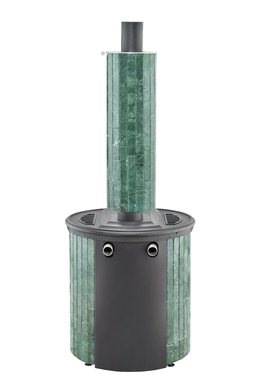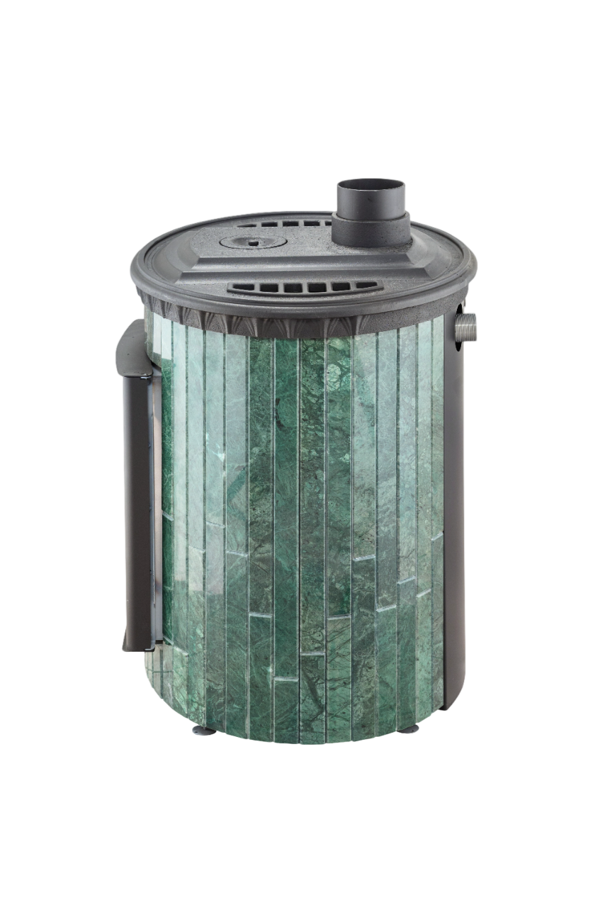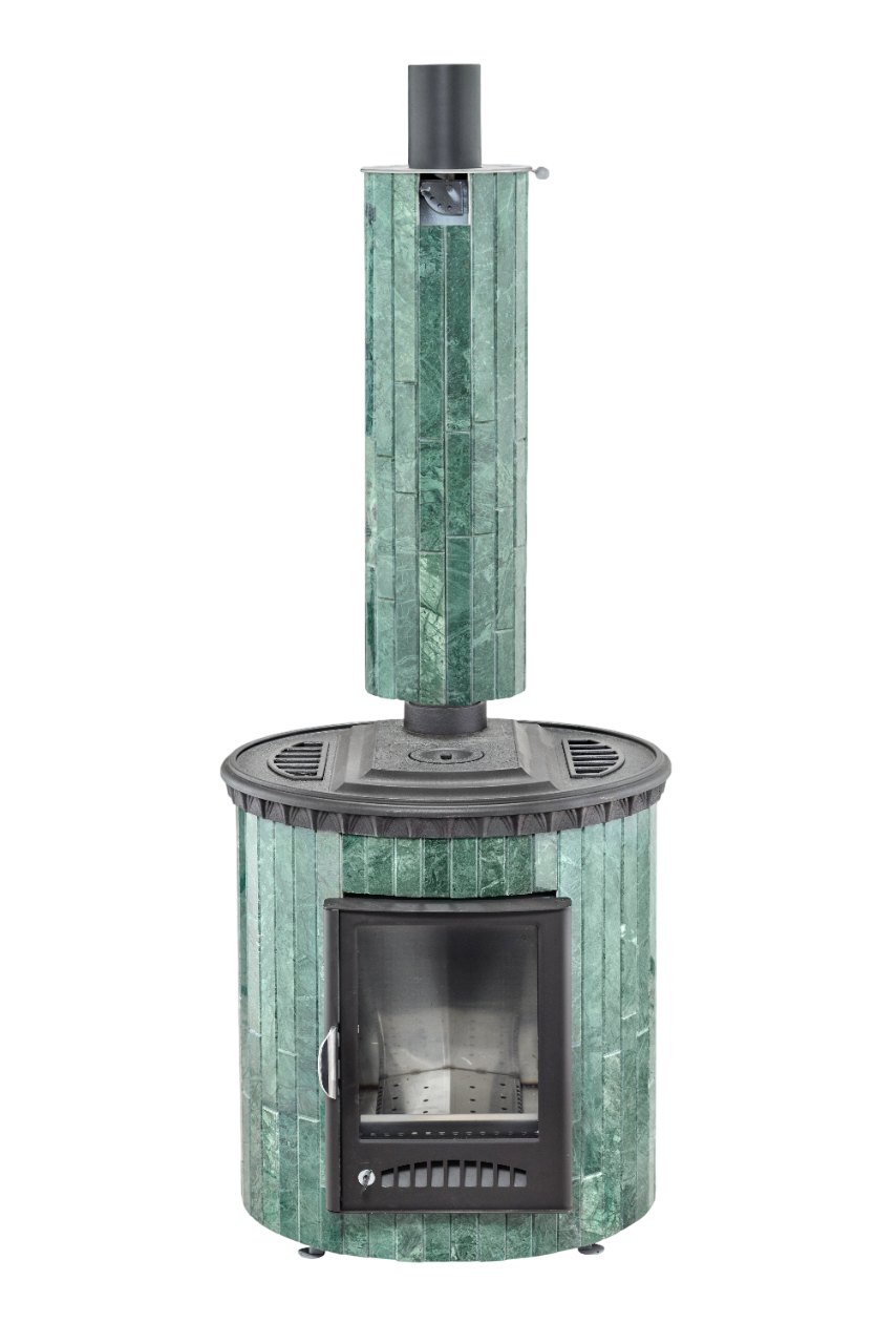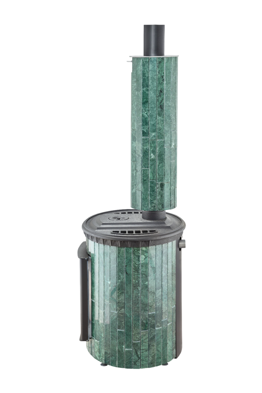 Для облицовки печи на заводе Vöhringer используют натуральный змеевик. Камень в слэбах разрезают на пластины, которые навешивают на отопительные печи для дома по технологии «Ламель». Топка в каменном обрамлении не только отлично выполняет основные функции, но и служит украшением интерьера.
