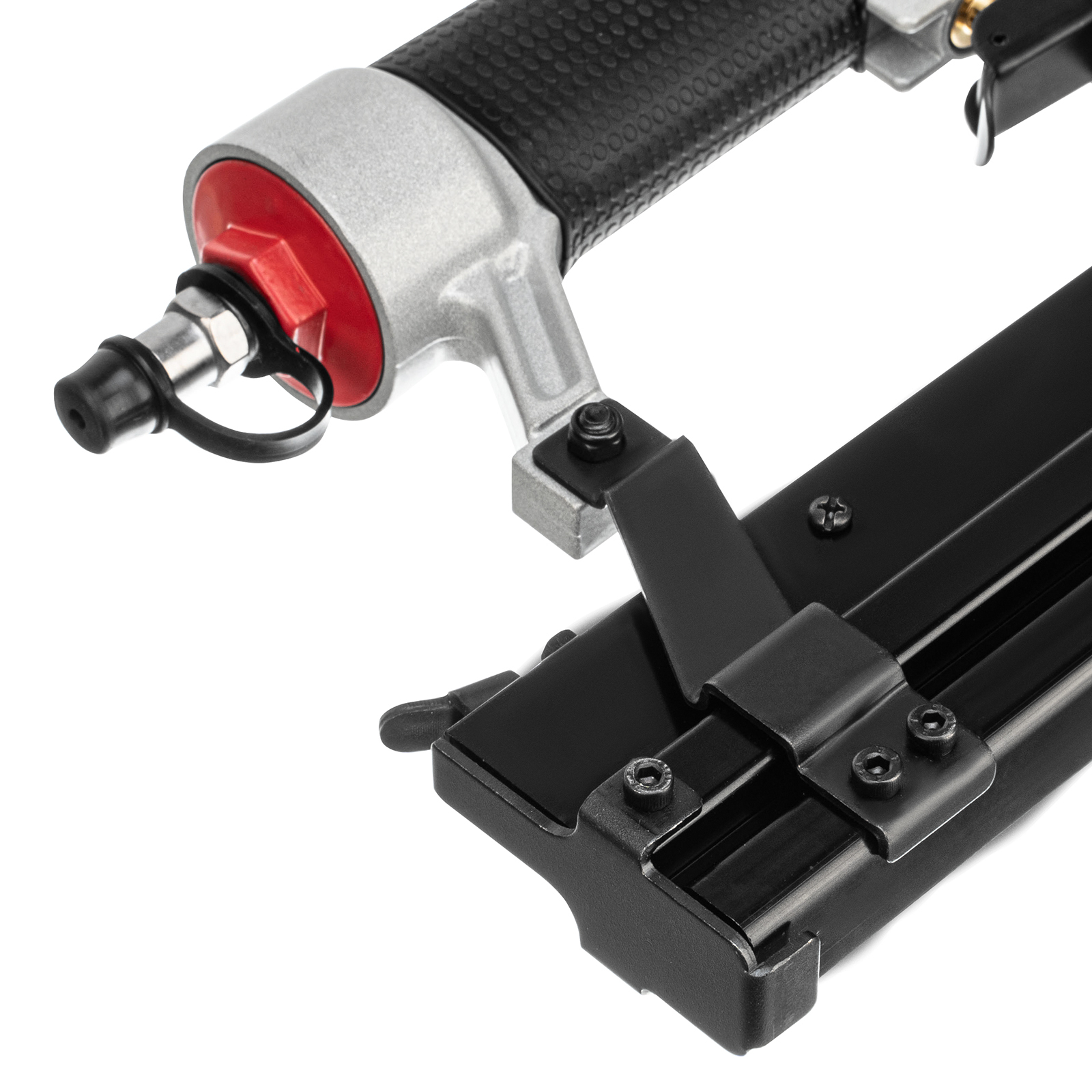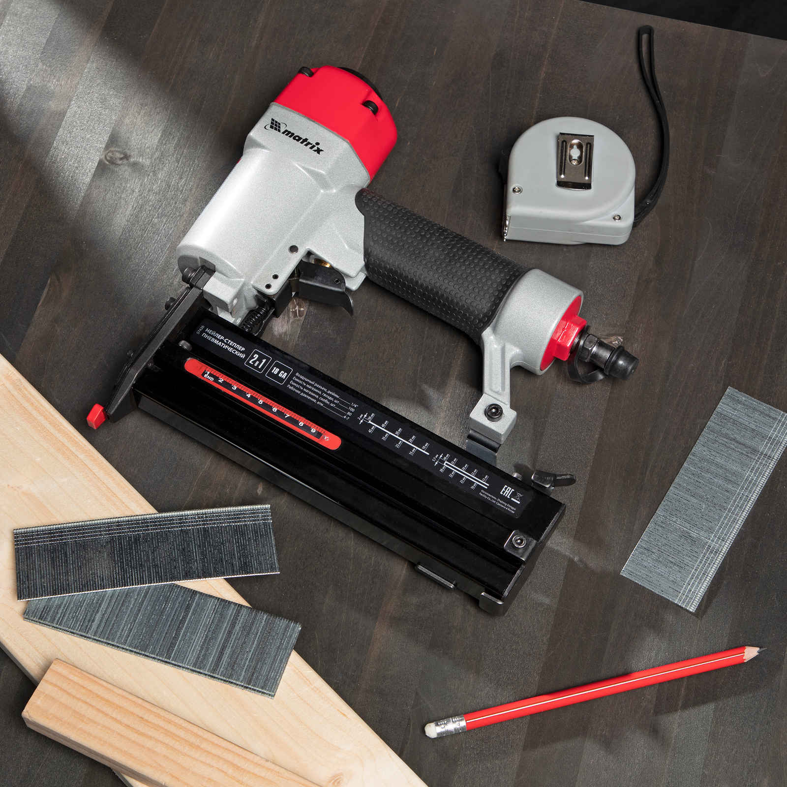 Пневматический нейлер-степлер 2 в 1 Matrix 57426 работает с двумя типами крепежей 18GA: гвоздями длиной 10-50 мм и скобами длиной 25-40 мм. Пригодится при сборке мебели и деревянных каркасов, для обшивки и утепления дома, при установке окон, дверей, плинтусов, напольных покрытий и для производства упаковки. Низкий расход воздуха 0,7 л/мин позволяет использовать инструмент с любыми типами компрессоров.