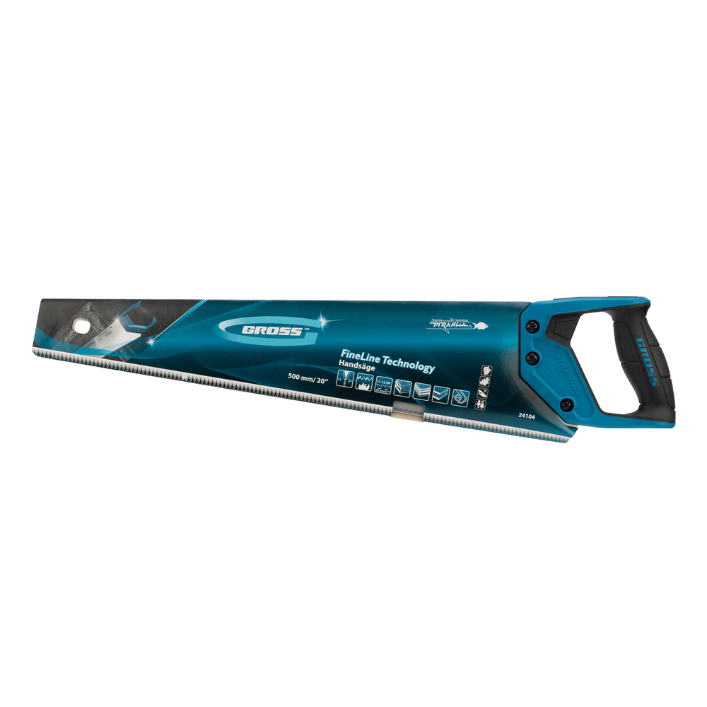 Ножовка по дереву Gross PIRANHA 24104 с полотном длиной 500 мм, калеными зубьями с 3D-заточкой и шагом 11-12 TPI, с 2-компонентной рукояткой, предназначена для распиловки заготовок из древесины, ДСП, ДВП, МДФ и ламината, а также из пластических материалов, таких как пенополистирол и полиуретан. Может производить продольный и поперечный распил. Мелкие зубья с шагом 11-12 TPI позволяют выполнять точный и чистый рез. Ножовка обладает высокой производительностью благодаря трехгранной заточке зубьев. Инструмент используется в столярном деле.