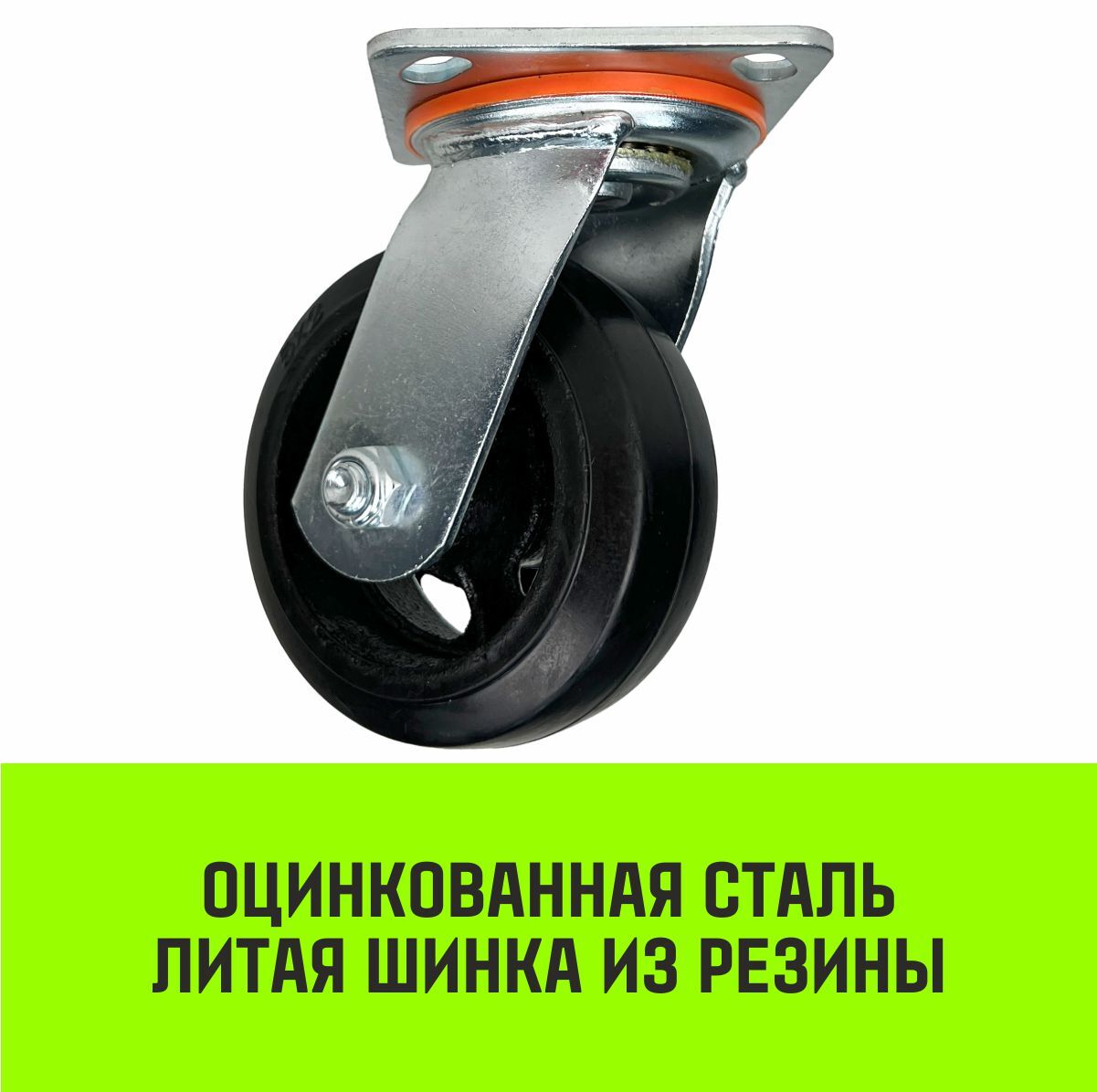 Большегрузное поворотное колесо устанавливается в платформенные тележки, вышки-туры и другое складское и промышленное оборудование. Прочный обод колеса, шириной 50 мм, изготовлен из чугуна, шинка – из черной литой резины. Нагрузка на колесо распределяется равномерно.