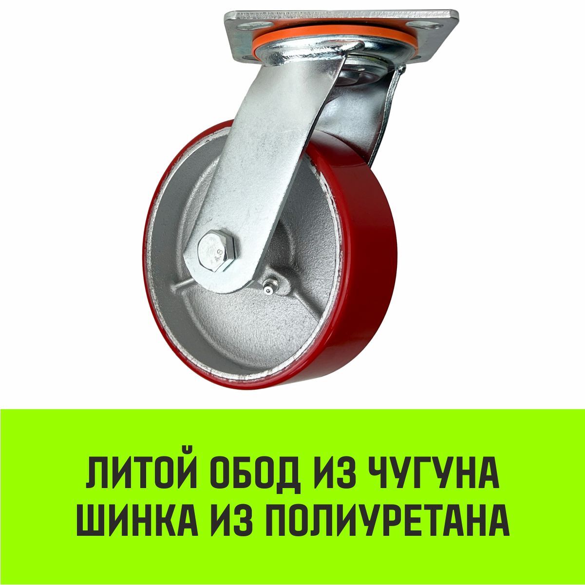 Большегрузное колесо из полиуретана с чугунным ободом используется для установки в тяжелое складское, промышленное и строительное оборудование.