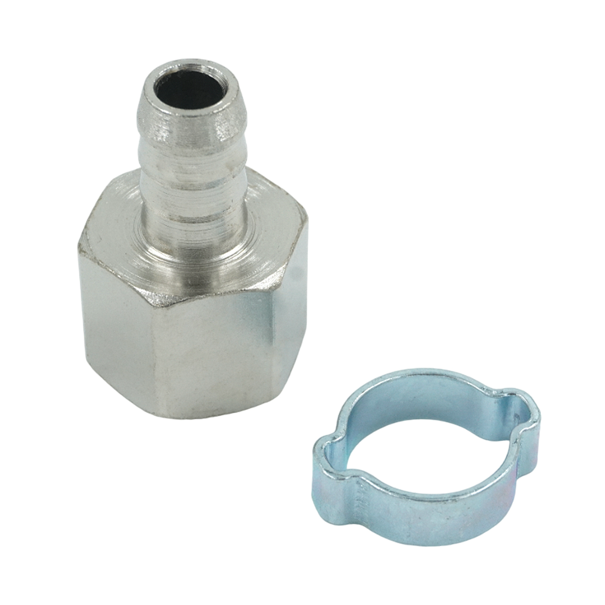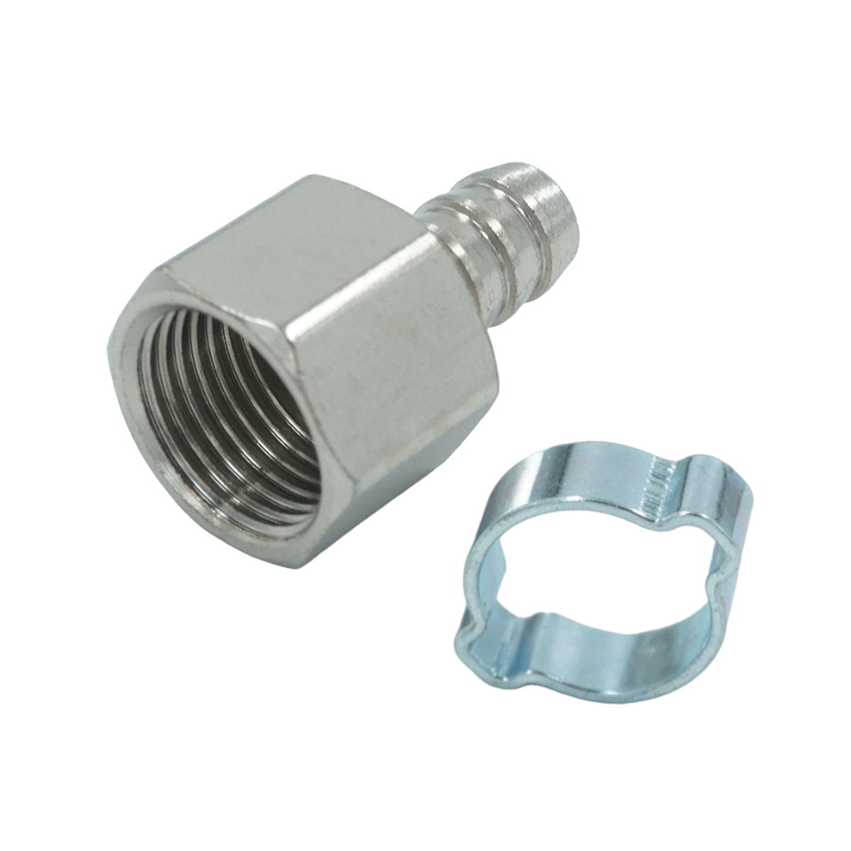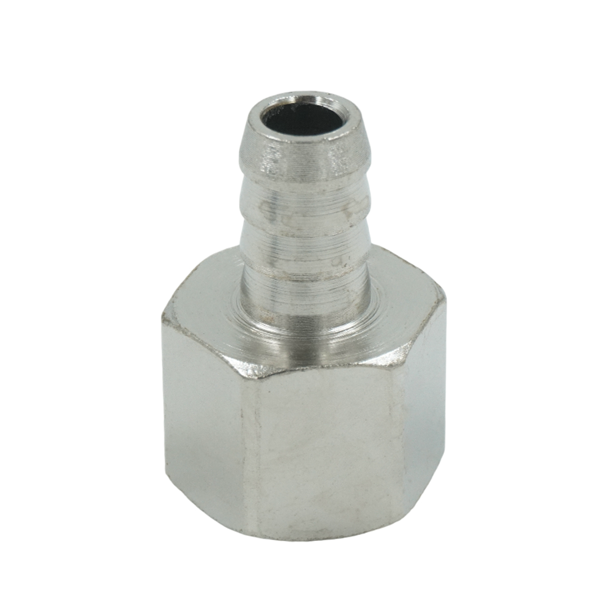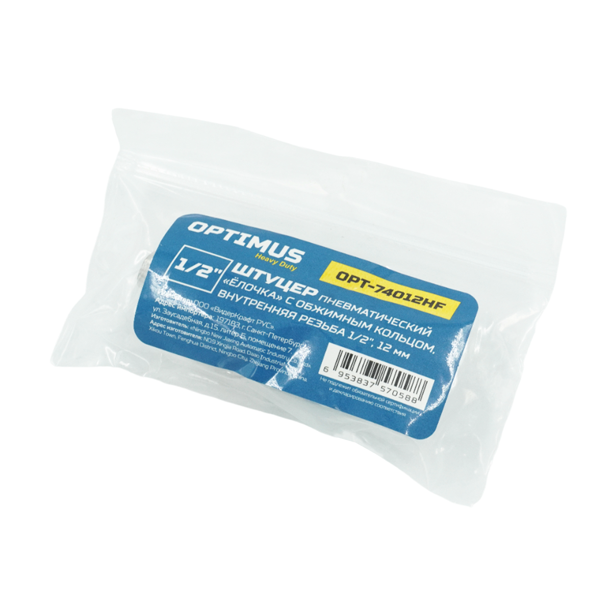 Пневматический штуцер типа ёлочка с обжимным кольцом и внутренней резьбой 1/4", диаметр 12 мм. Обеспечивает надежное и герметичное соединение.