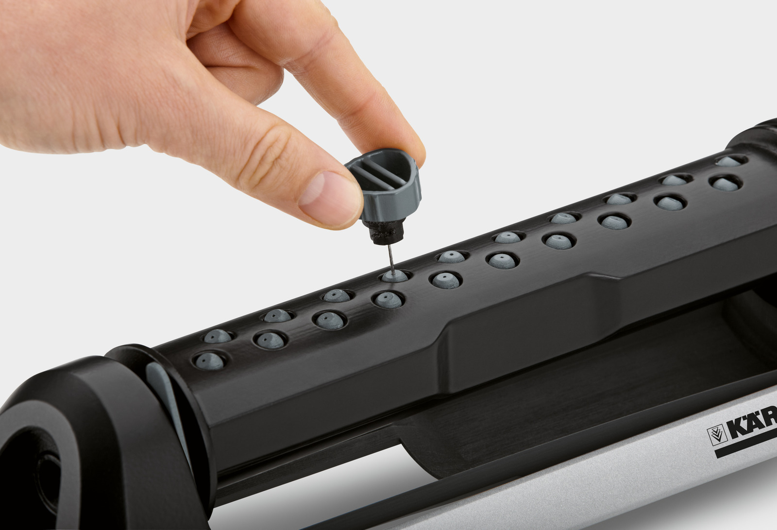 OS 5.320 SV оснащен испытанной системой стыкового соединения и встроенным брызговиком SplashGuard, защищающим пользователя от намокания при установке и настройке дождевателя, а также механизмом регулировки ширины зоны орошения.