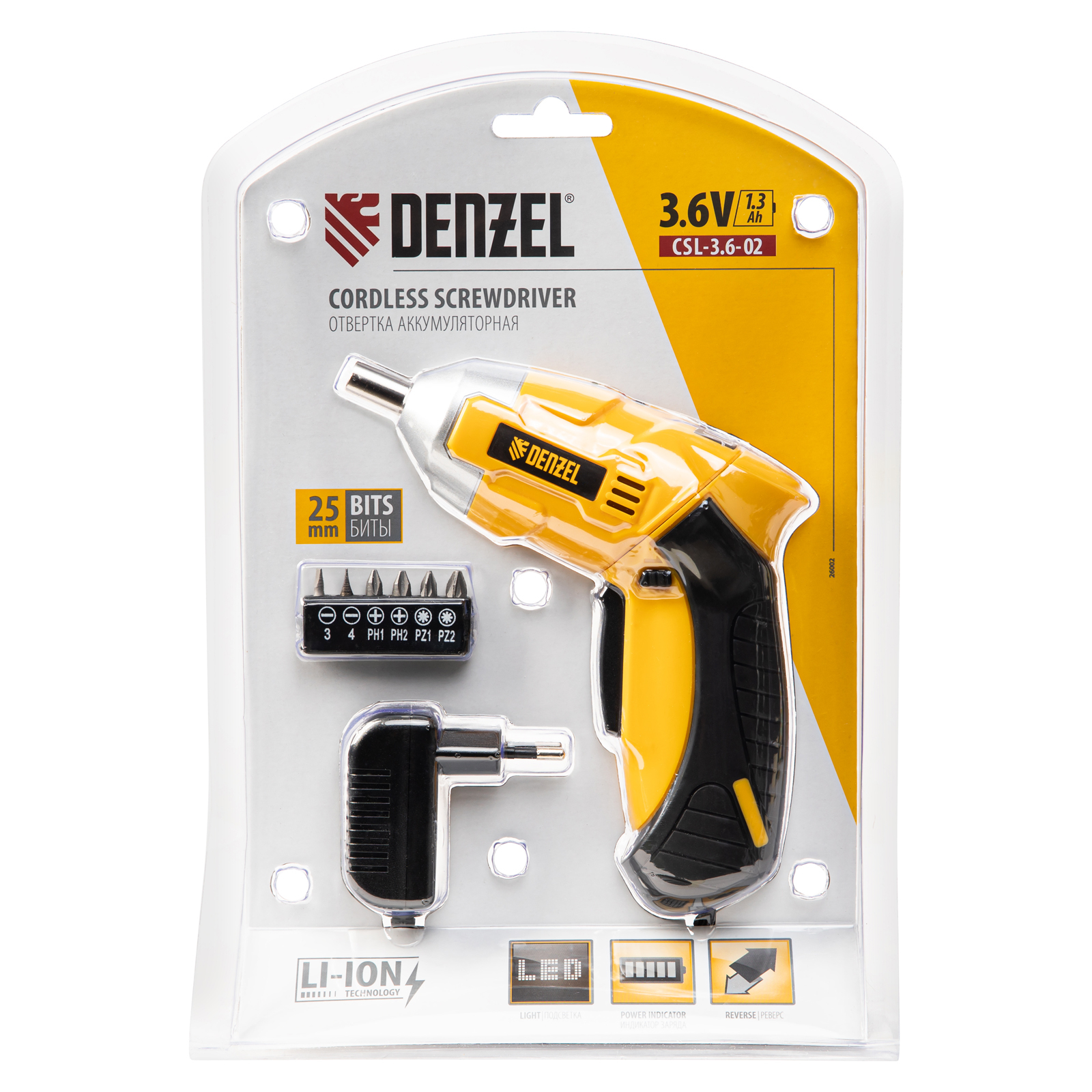 Аккумуляторная отвертка Denzel CSL-3,6-02 26002 работает от источника питания Li-Ion 1,3 Ач напряжением 3,6 В, поставляется в блистере. Предназначена для быстрого закручивания и откручивания шурупов, болтов и саморезов. Отвертка развивает крутящий момент до 4 Нм и частоту вращения патрона 200 об/мин, что позволяет легко и без усилий решать поставленные задачи. ,Литий-ионный аккумулятор имеет низкий процент саморазряда, быстро заряжается, а эффект памяти отсутствует, что обеспечивает стабильную работу на протяжении длительного времени.